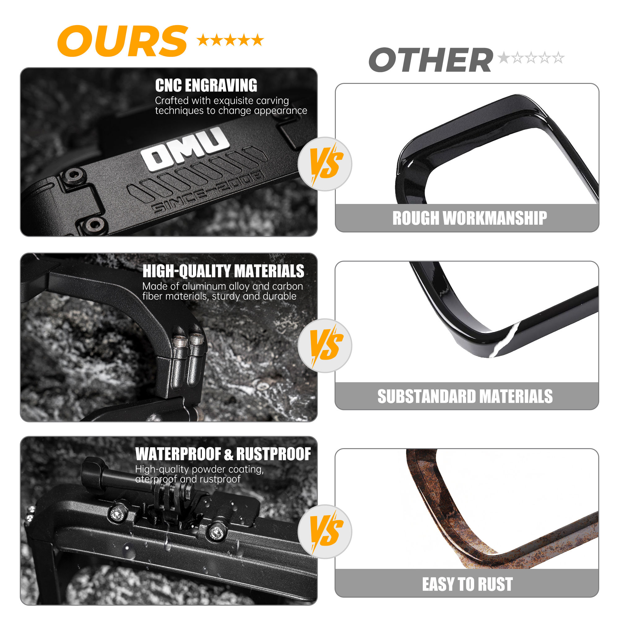 - ALUMINUM ALLOY BODY, STURDY AND DURABLE: The main body of the rearview mirror rain shield is made of high-quality aluminum alloy material, which has excellent strength and corrosion resistance, and can withstand the challenges of harsh weather and off-road environments, ensuring long-term stable performance.