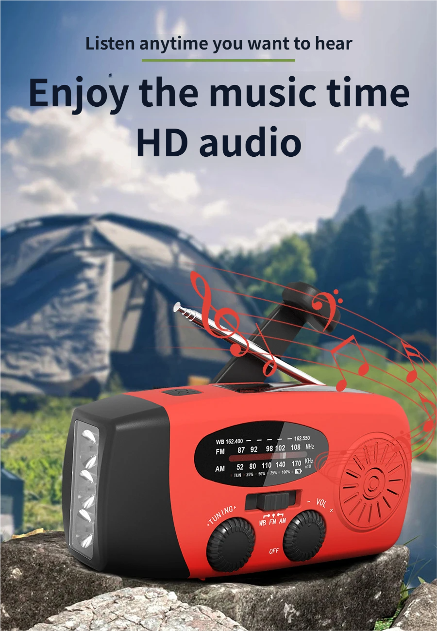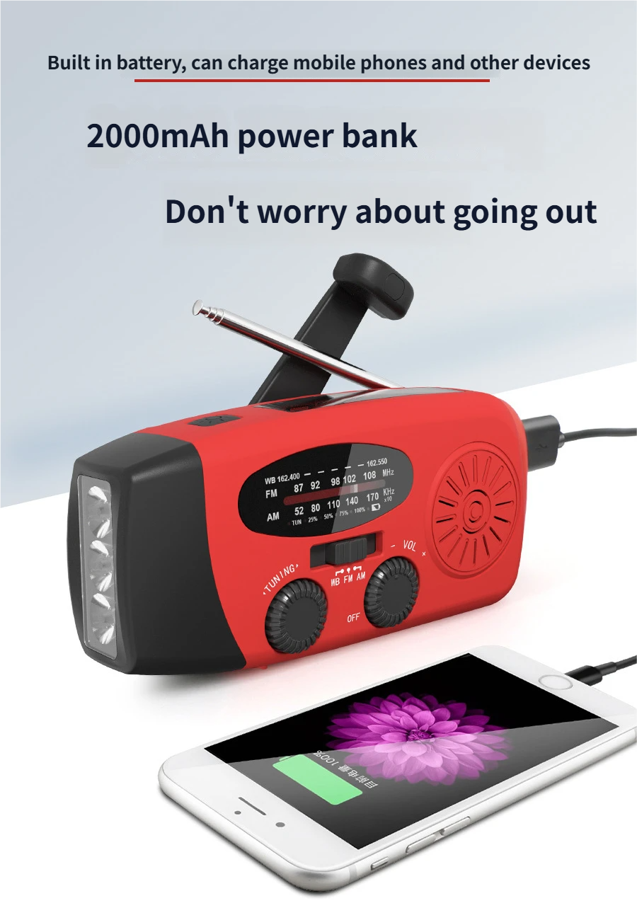 Overview This red solar radio is crafted with durable plastic material, designed for universal use with comprehensive full band reception and practical daily functions. Equipped with a 2000mAh batt...