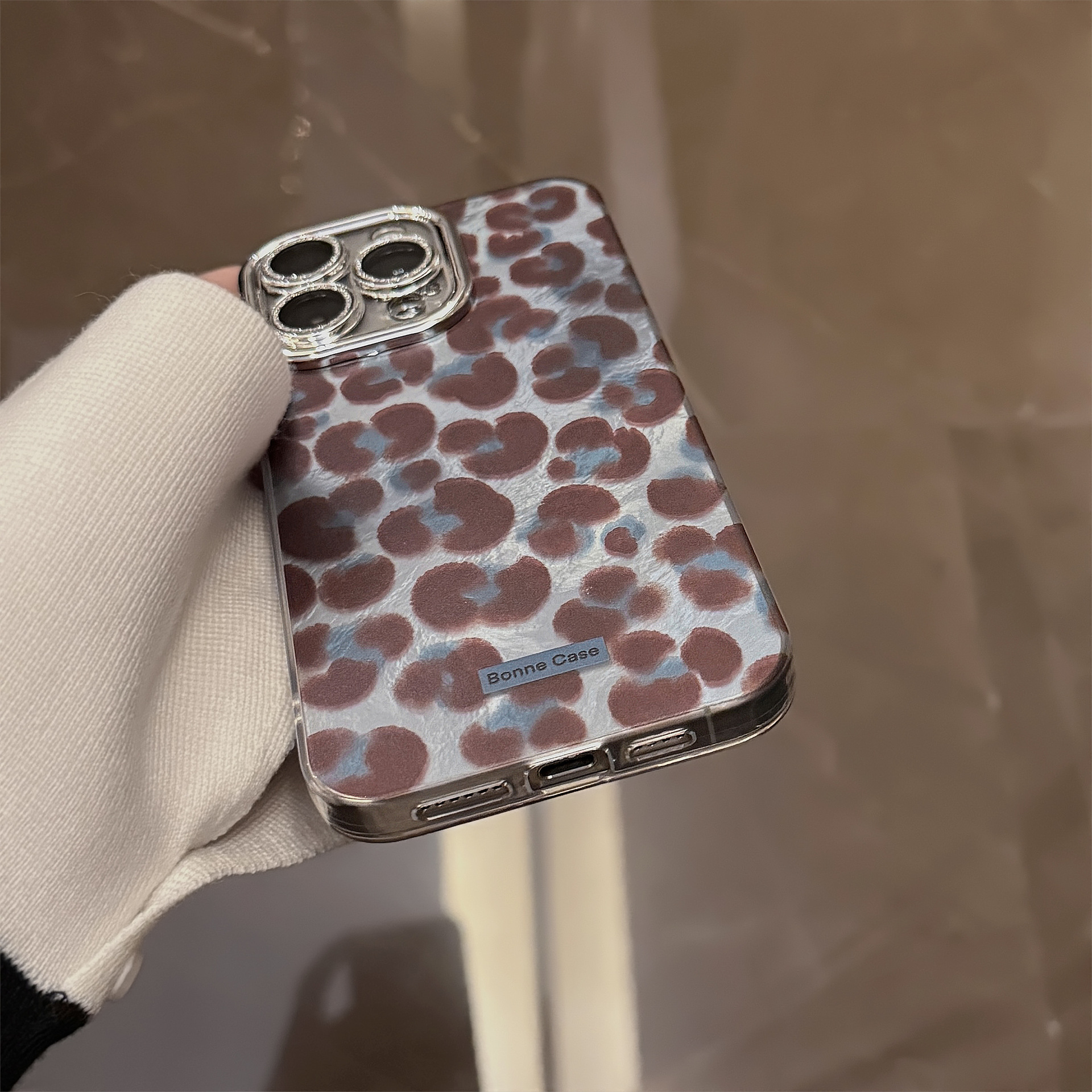 Product information:Color: Silver, blue-brown spotted leopard print + black-brown leopard-print spherical lanyard; silver, blue-brown spotted leopard print Compatible Models: Apple Function: Drop prot...