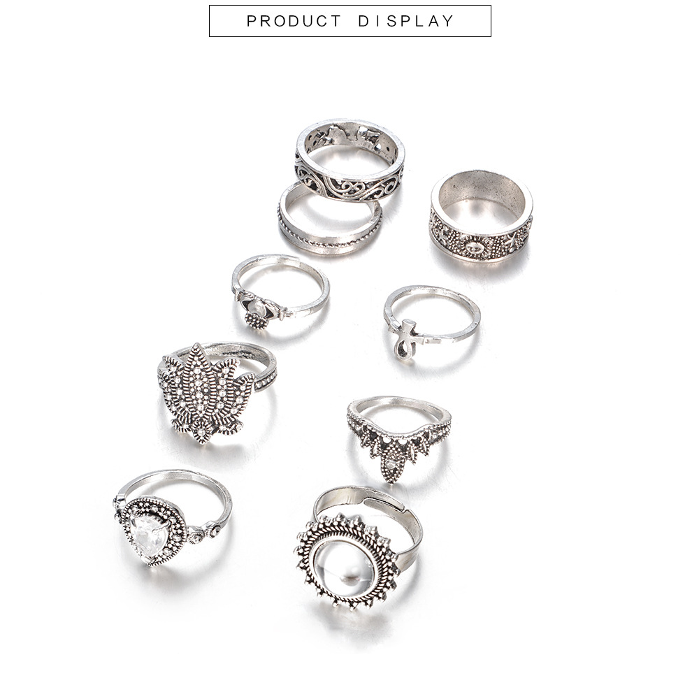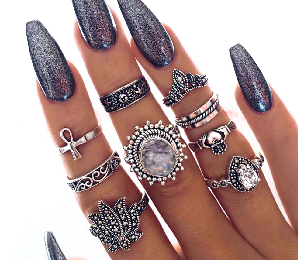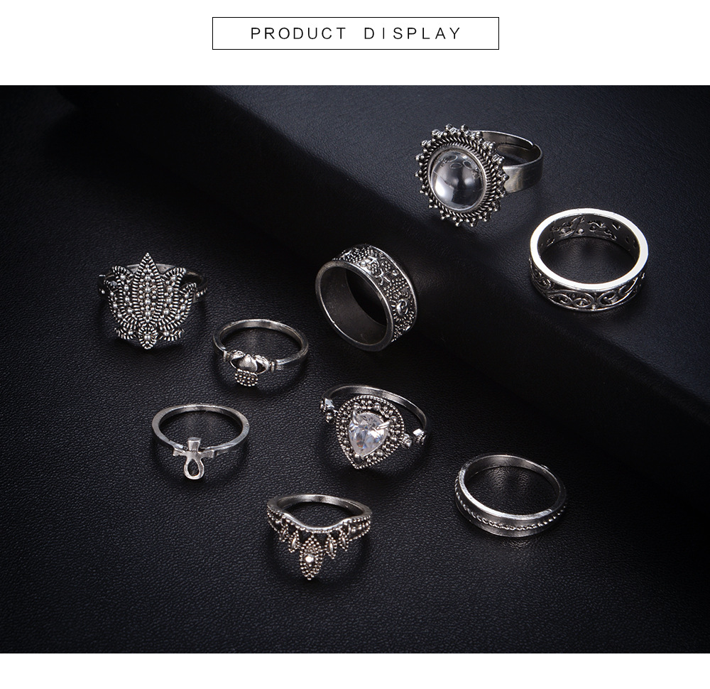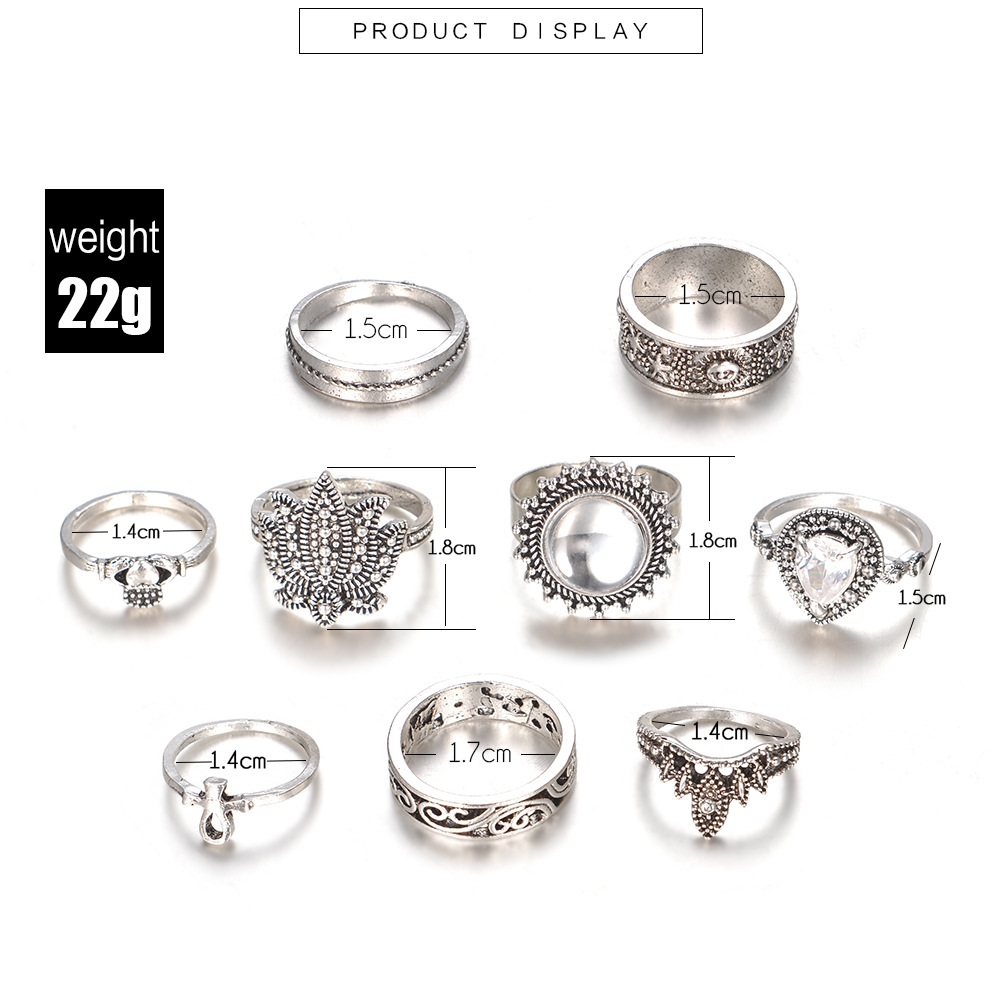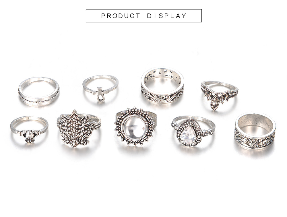 Retro Ethnic-Style Joint Ring Set Of 9 With Bold Gemstone Combinations