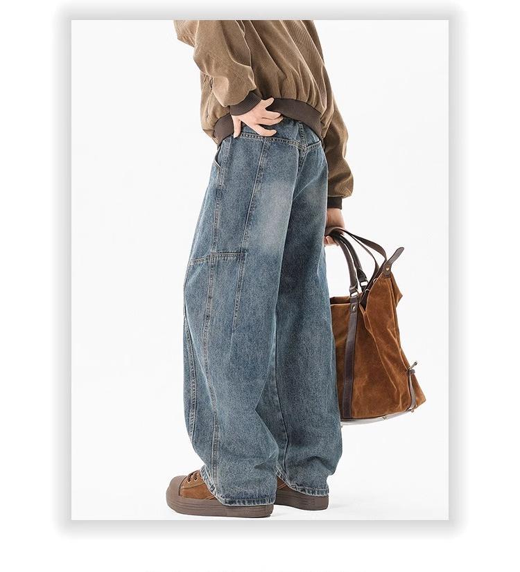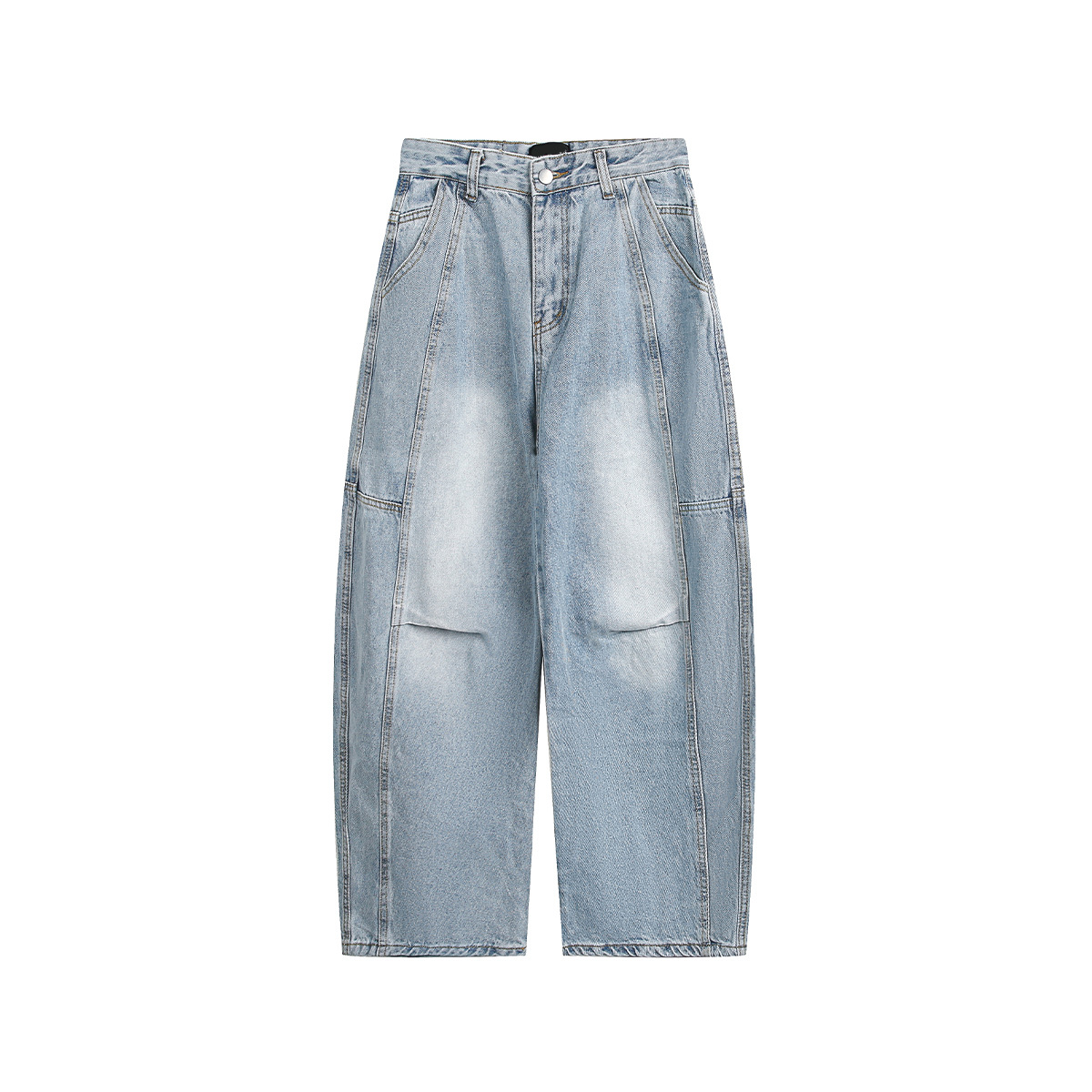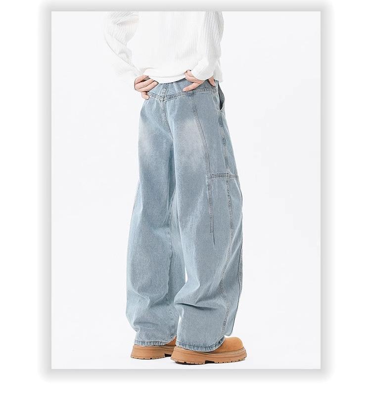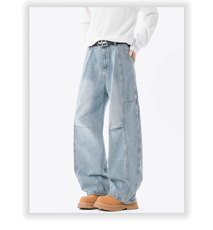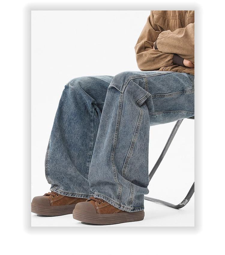 Retro Pleated Washed Denim Jeans Mens Straight-Leg Loose-Fit