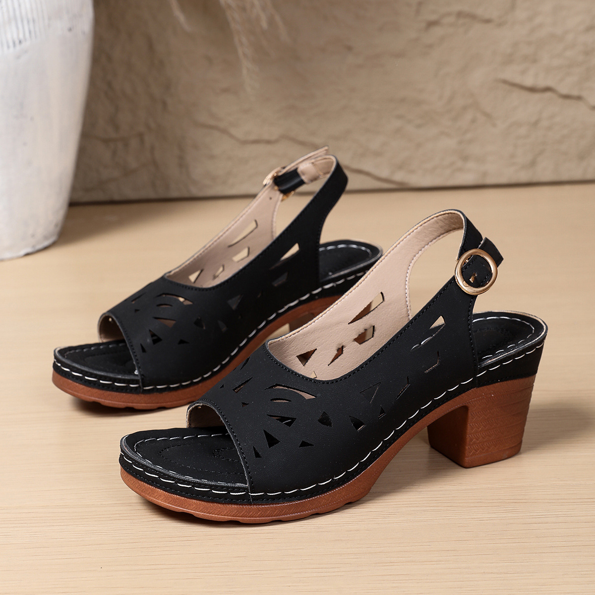 Retro-style Hollow-out Fashionable Fish-mouth Sandals With A Buckle For Outerwear