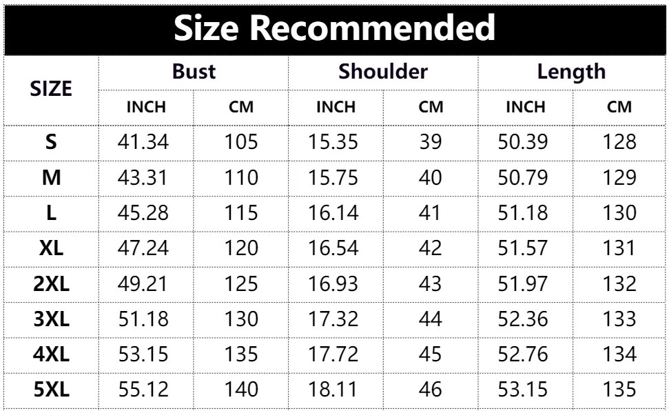 Sizes: S, M, L, XL, XXL, XXXL, 4XL, 5XL