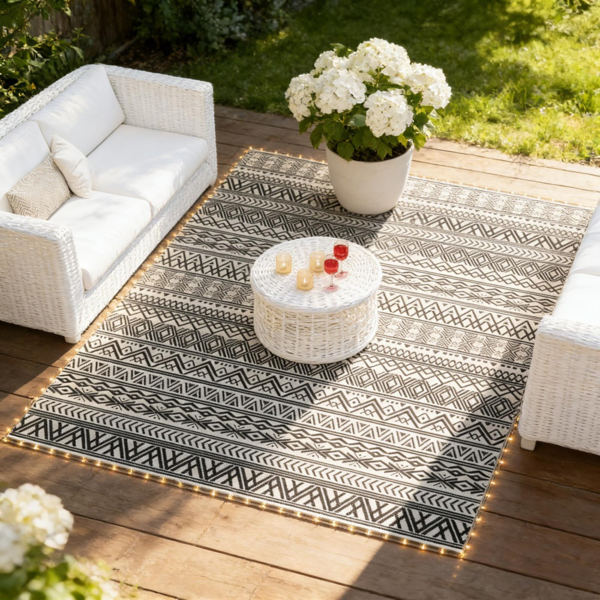 - This outdoor rug is made of 310g/m² PP with 2% UV protection