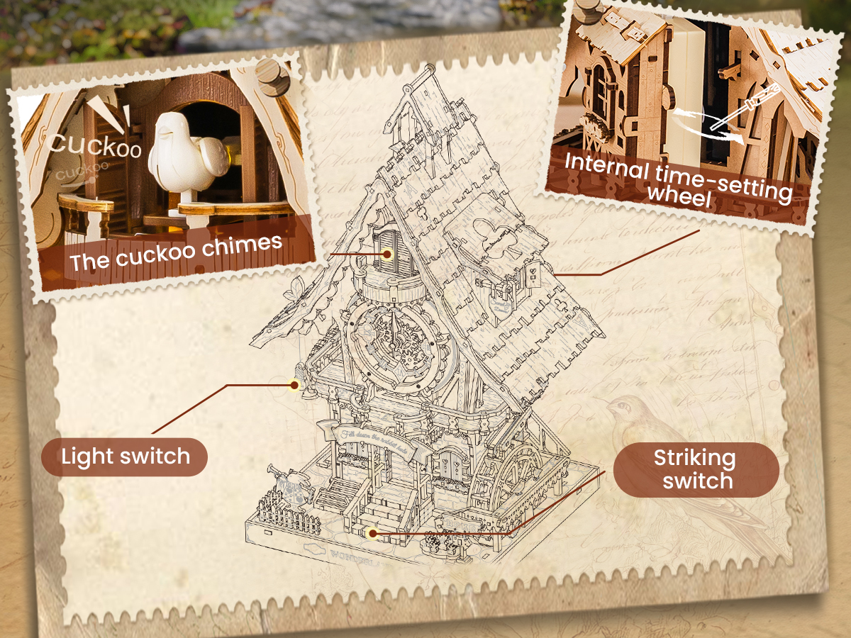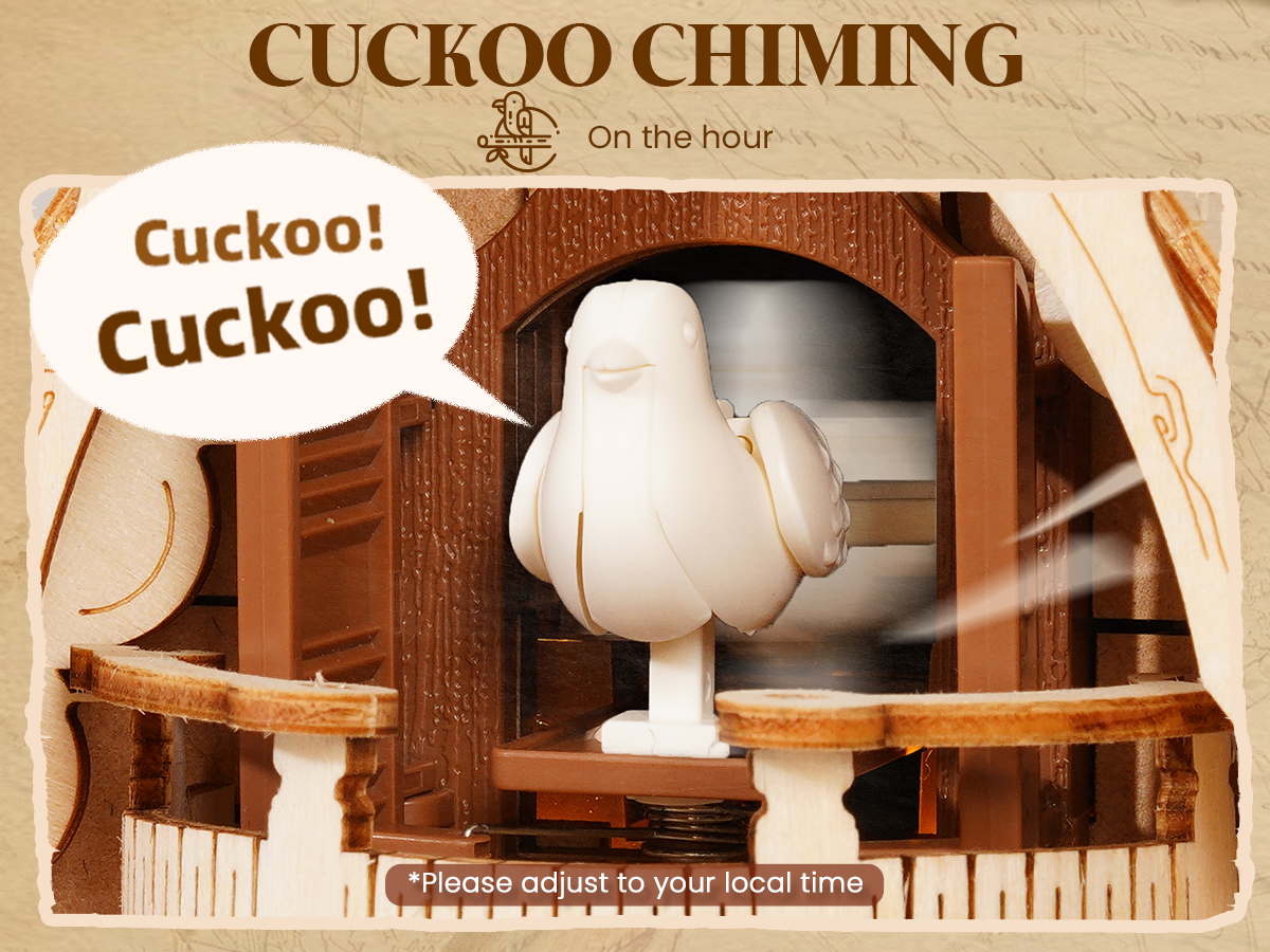 This DIY clock adds classic charm to your home! Press the stair button to activate the mechanism: every hour on the hour, a cute cuckoo appears, flapping its wings and singing three classic "Cuckoo" melodies, creating a delightful and interactive home centerpiece.