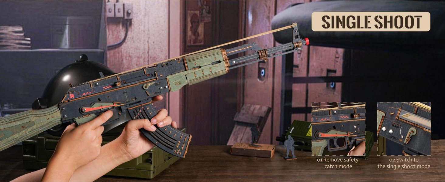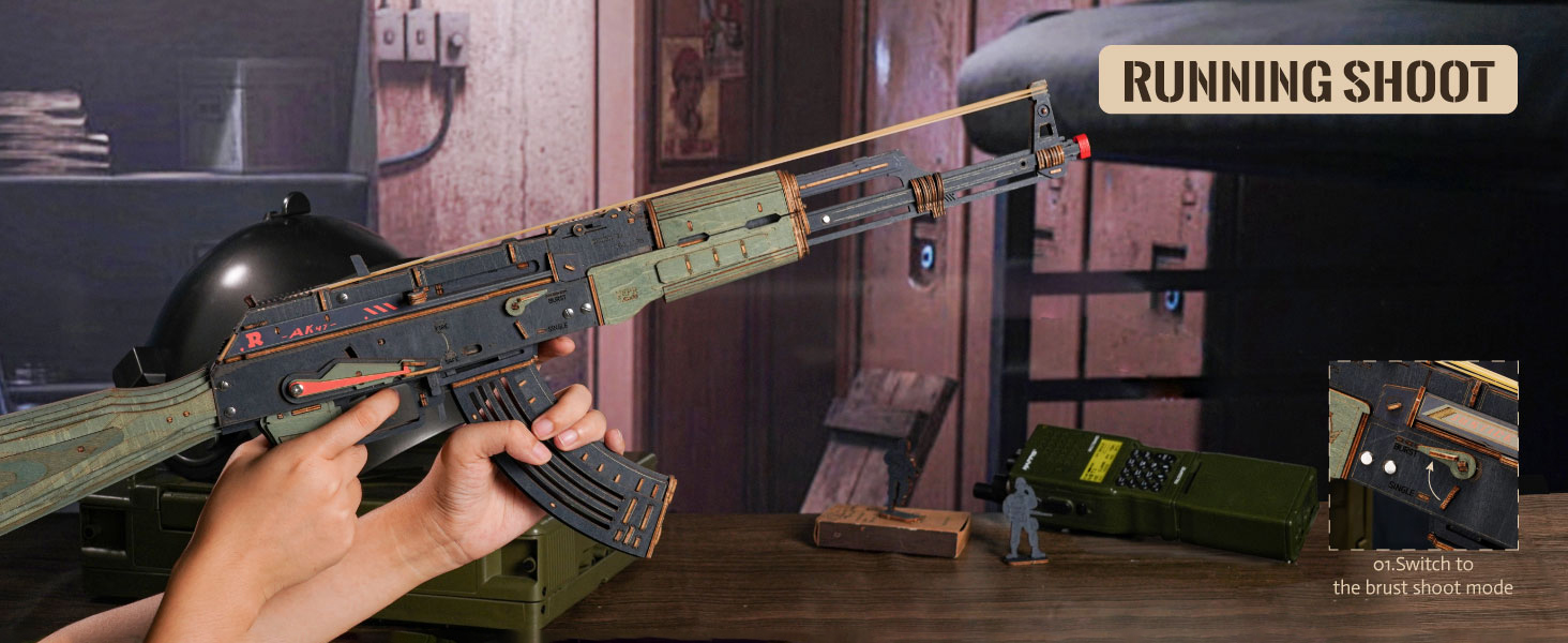 【Dual-Mode Firing System】 Switch between single and burst fire at will! The innovative design allows for both precise single-shot shooting and 12-round burst fire, recreating the classic operating experience. Equipped with dedicated rubber bands for safety and fun, providing an immersive play experience.