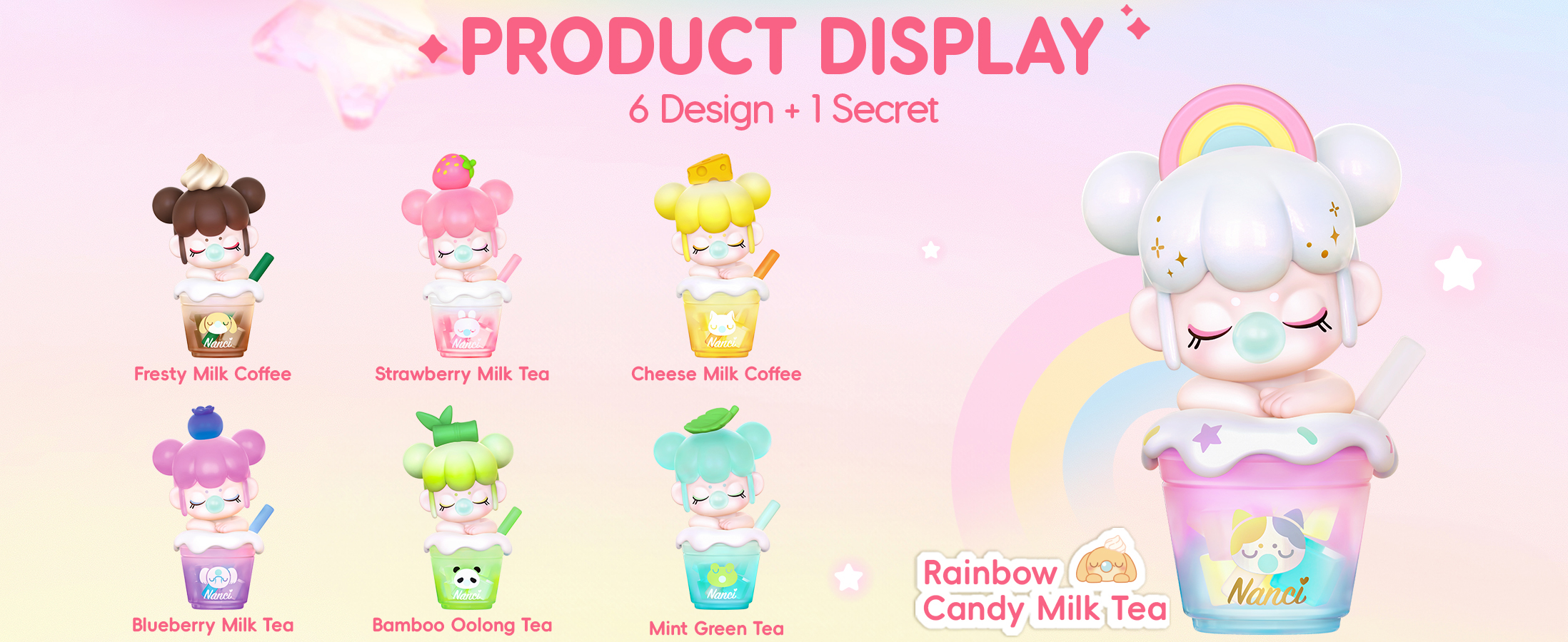 Sip into cuteness with Rolife BabyNanci Milk Tea Dolls-6 tasty cups + 1 hidden rainbow, each sparkling with glow-in-the-dark ice cubes for extra fun!