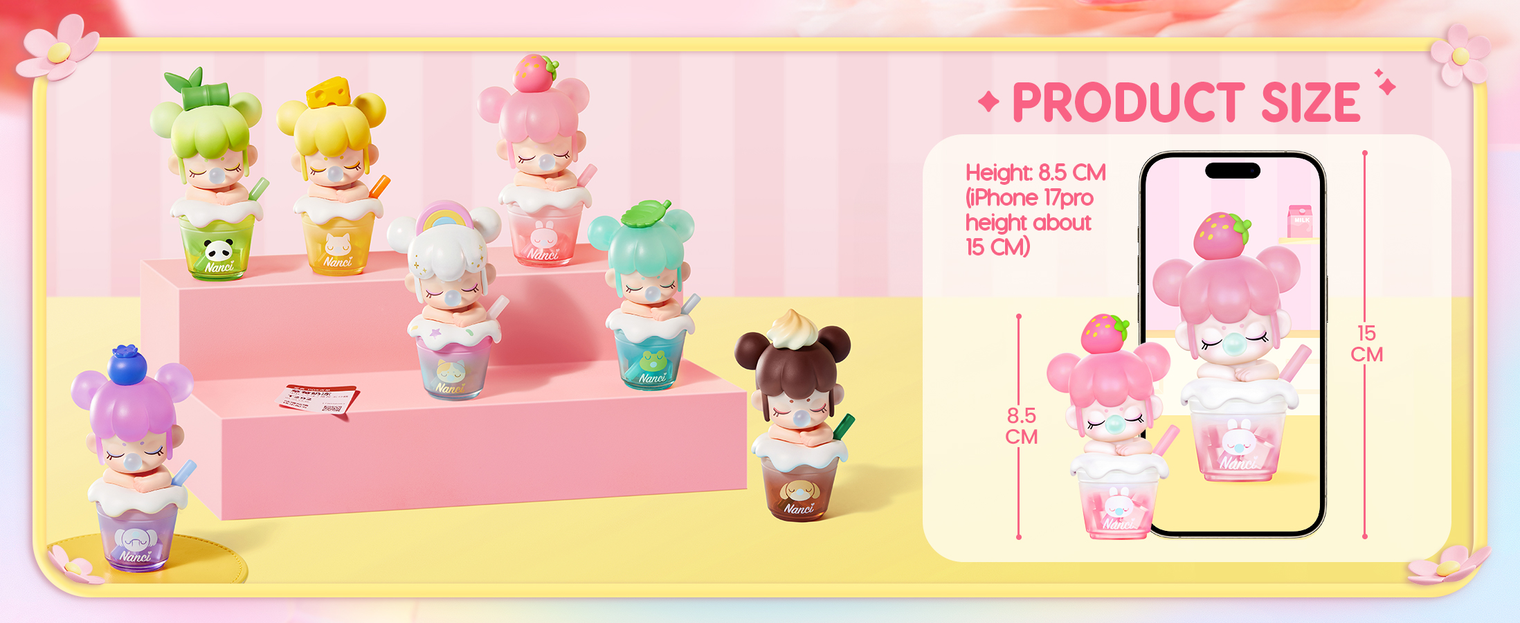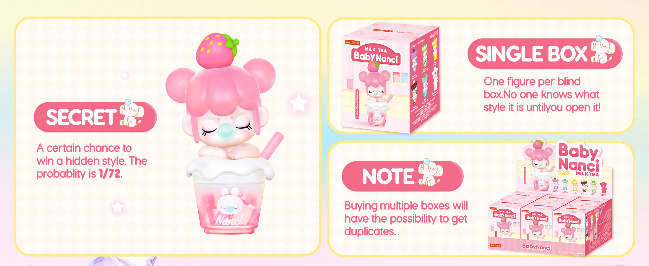 Sip into cuteness with Rolife BabyNanci Milk Tea Dolls-6 tasty cups + 1 hidden rainbow, each sparkling with glow-in-the-dark ice cubes for extra fun! Important Purchase Notes: 1. Blind box items c...