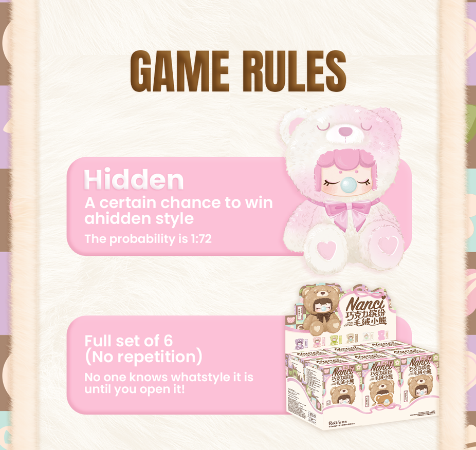 【Chocolate Colorful Surprise Series】 Explore the magical Nanci Chocolate Bear series, featuring 6 adorable regular versions and 1 exclusive hidden version. Each blind box brings a unique surprise and fun!