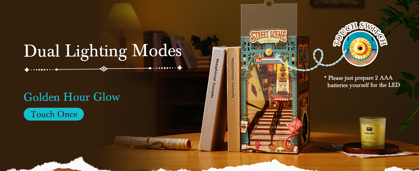 【Dual Lighting Modes】 Switch between a realistic daylight mode illuminating the streetscape and a warm nighttime mode illuminating building windows. Simply toggle the mode to transform your display area into an atmospheric urban space.