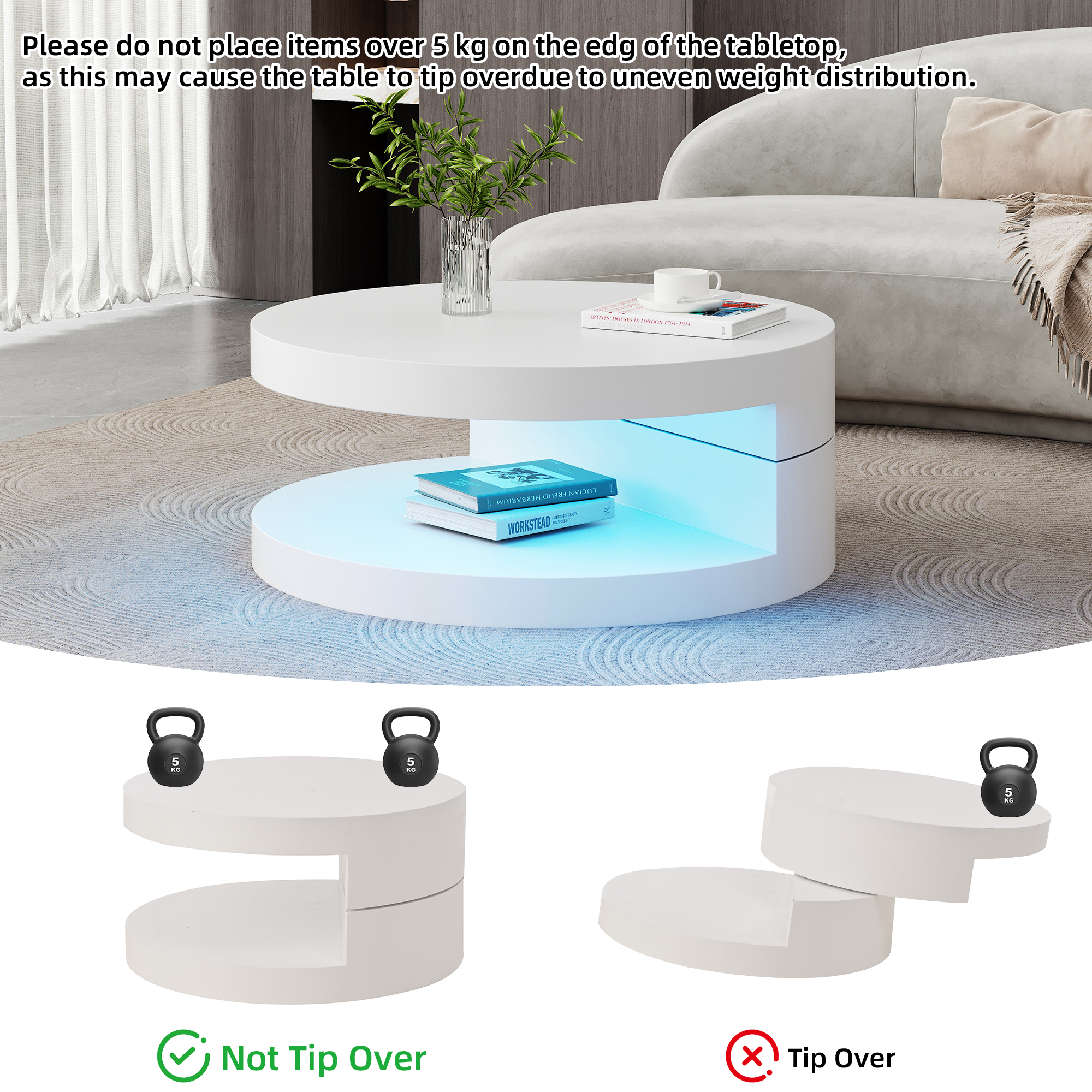 Round Rotating Coffee Table With LED Lights, 360 Rotating Tabletop, End Table, Double Layer Sofa Sidetable, Open Storage Space, 70x70x35.5cm, MDF, White