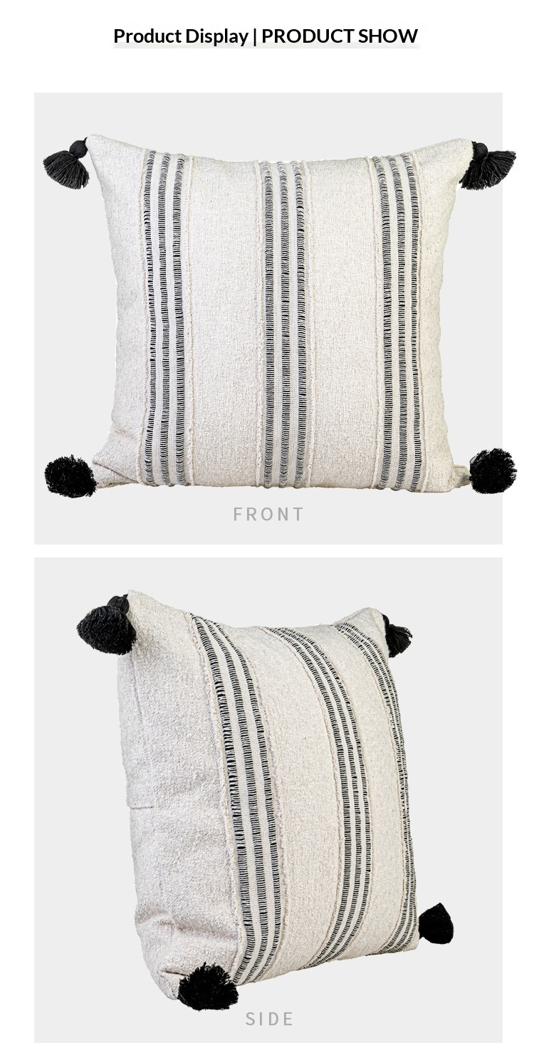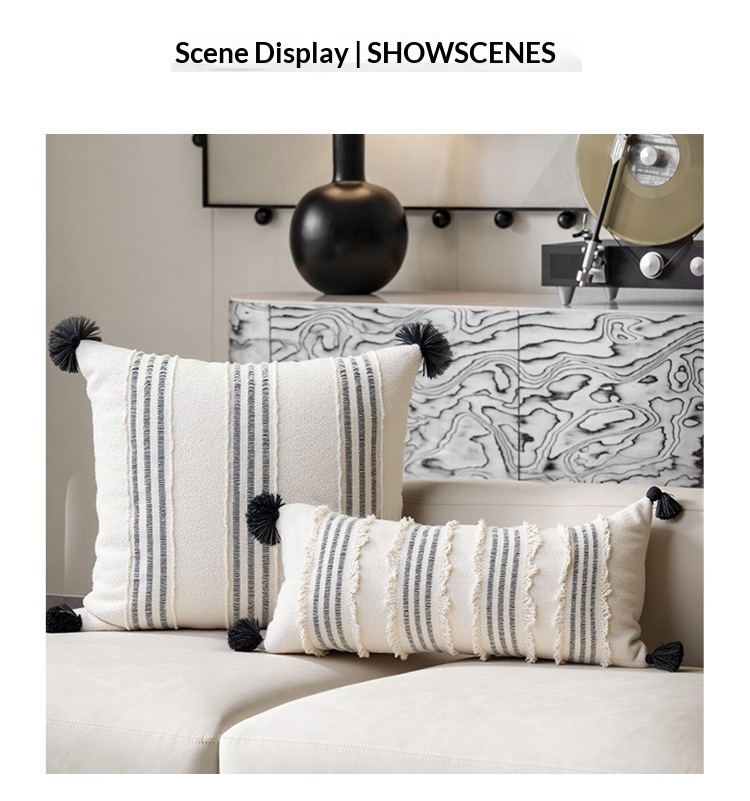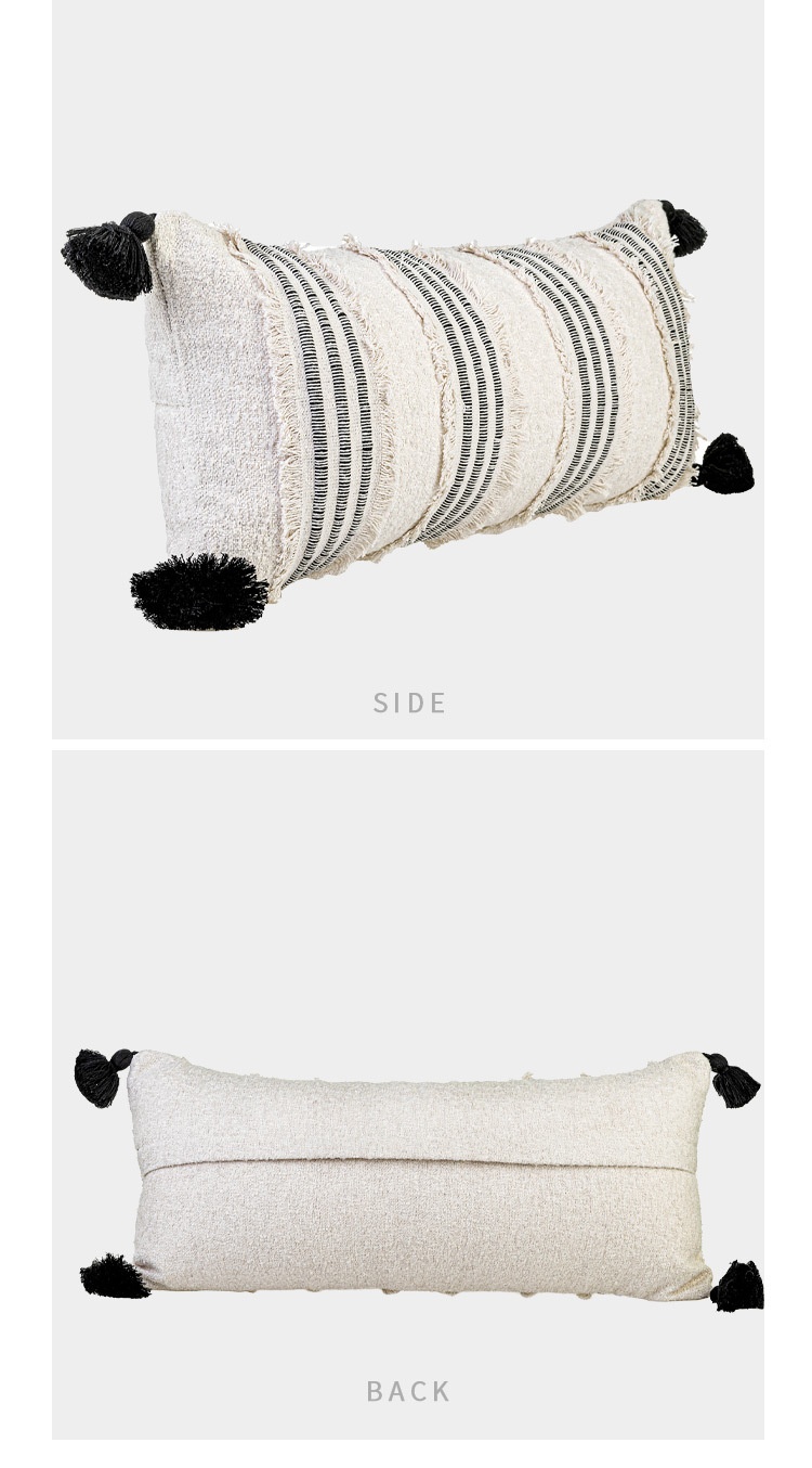 Product information:Pattern: Striped Color: 50×50 cm beige-black patchwork tasseled square pillow, 30×65 cm beige-black patchwork tasseled long lumbar pillow, 45×45 cm beige-black patchwork tasseled s...