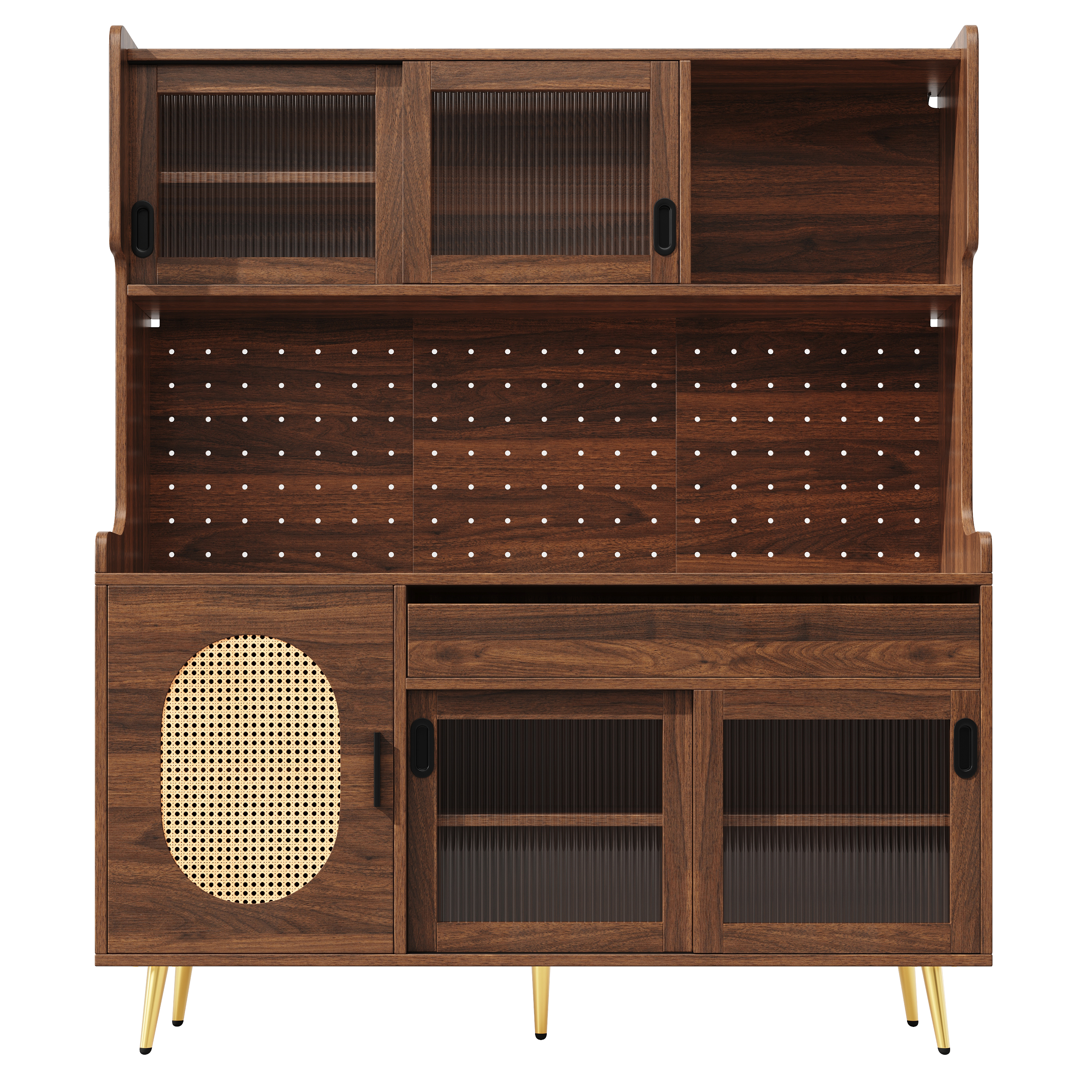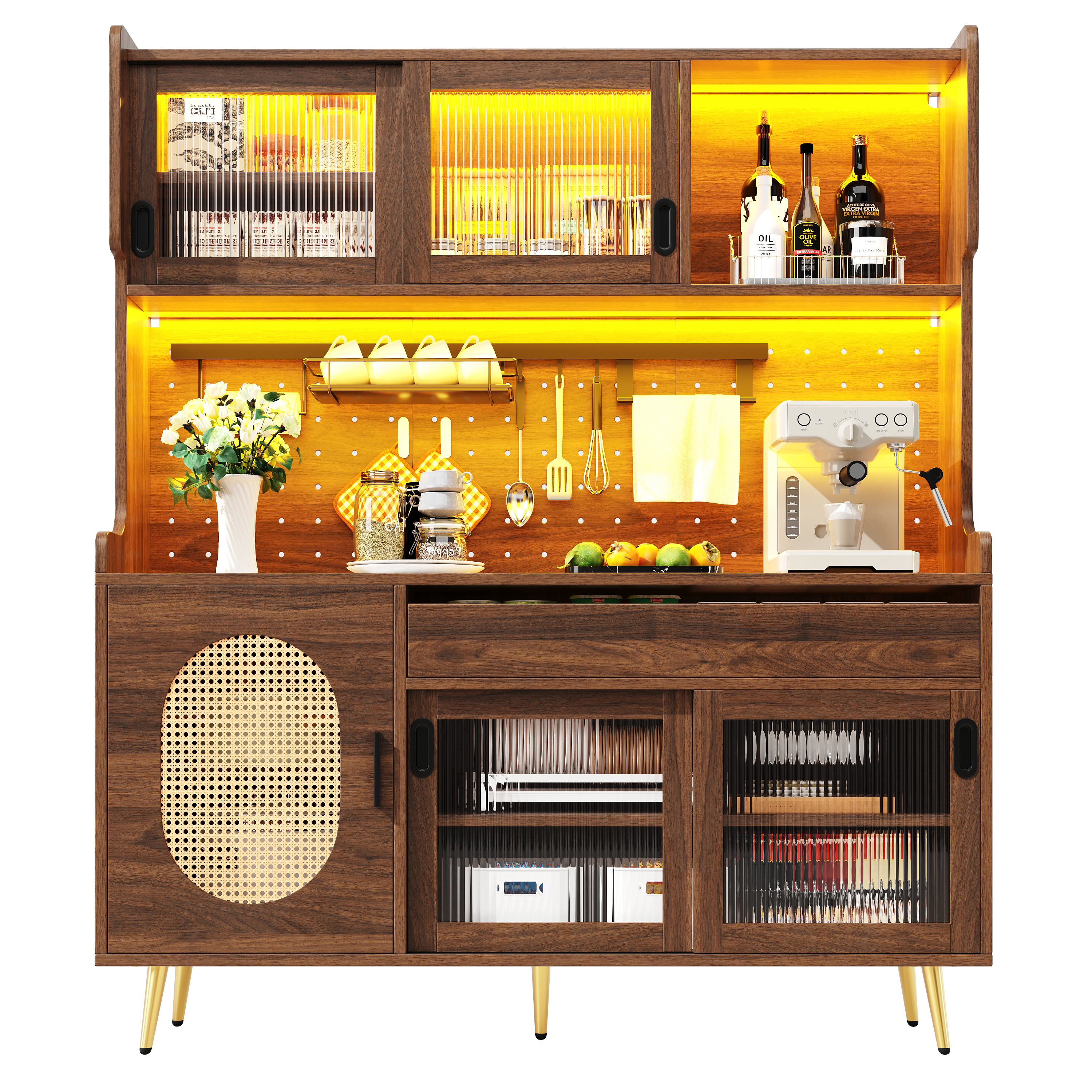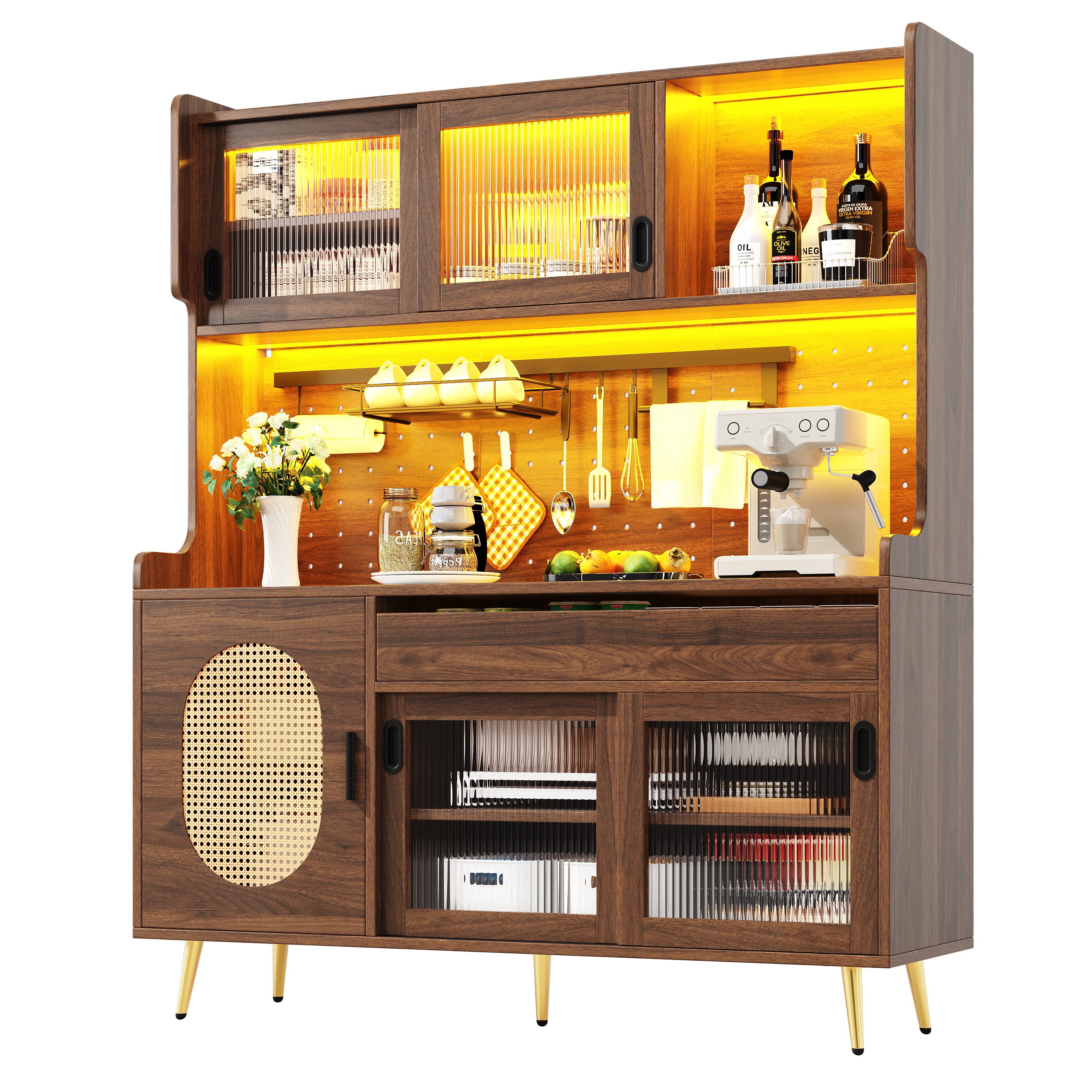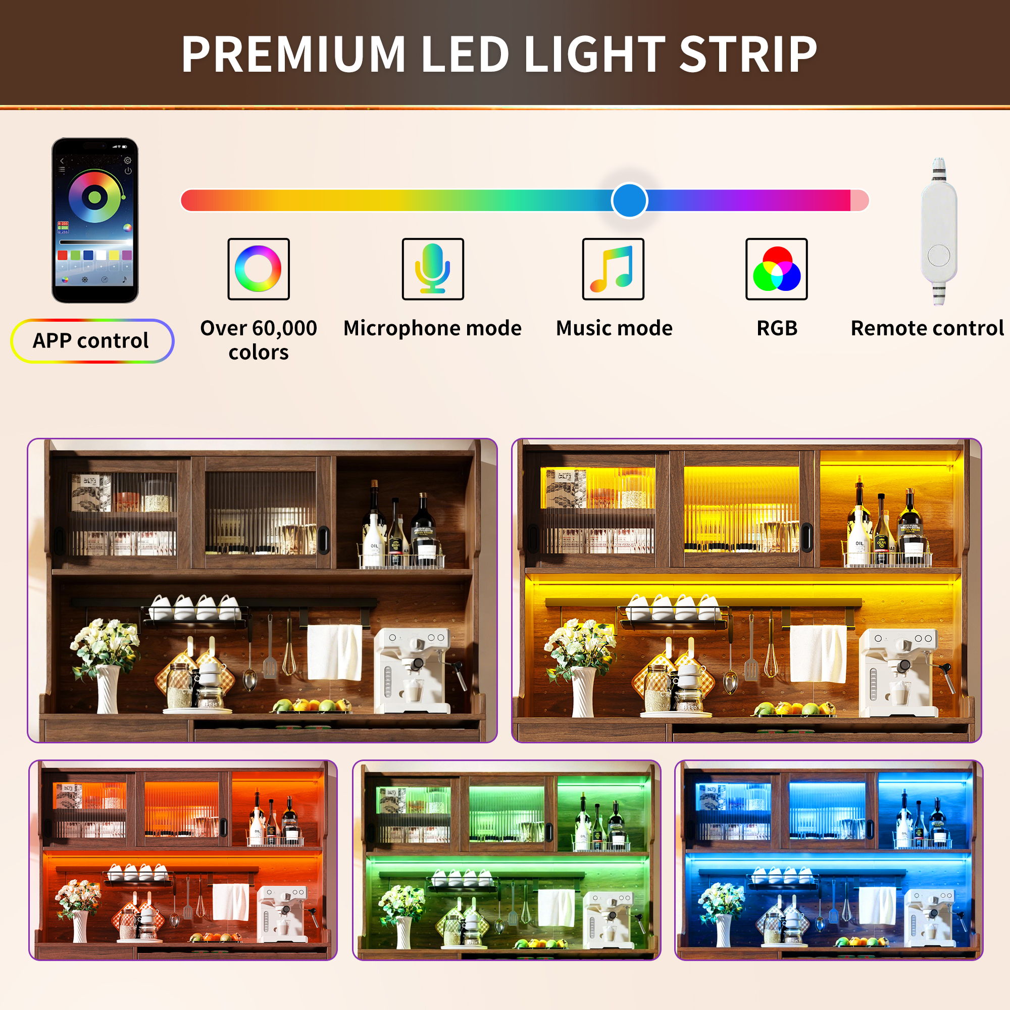 Sideboard Storage Cabinet Kitchen Cabinet Buffet, 145x39x171cm, Country Style, 5 Doors, With LED Light Strip & Pegboard, Fluted Glass Doors, Brown Black