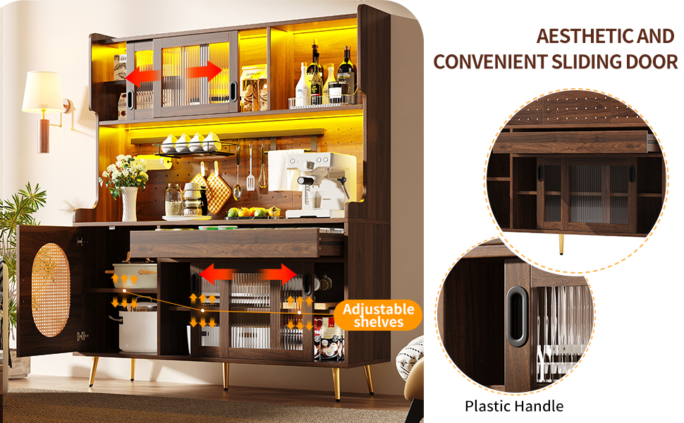 Product Name:Sideboard / Storage Cabinet / Kitchen Cabinet / Buffet, 145x39x171cm, Country Style, 5 Doors, with LED Light Strip & Pegboard, Fluted Glass Doors, Brown/Black