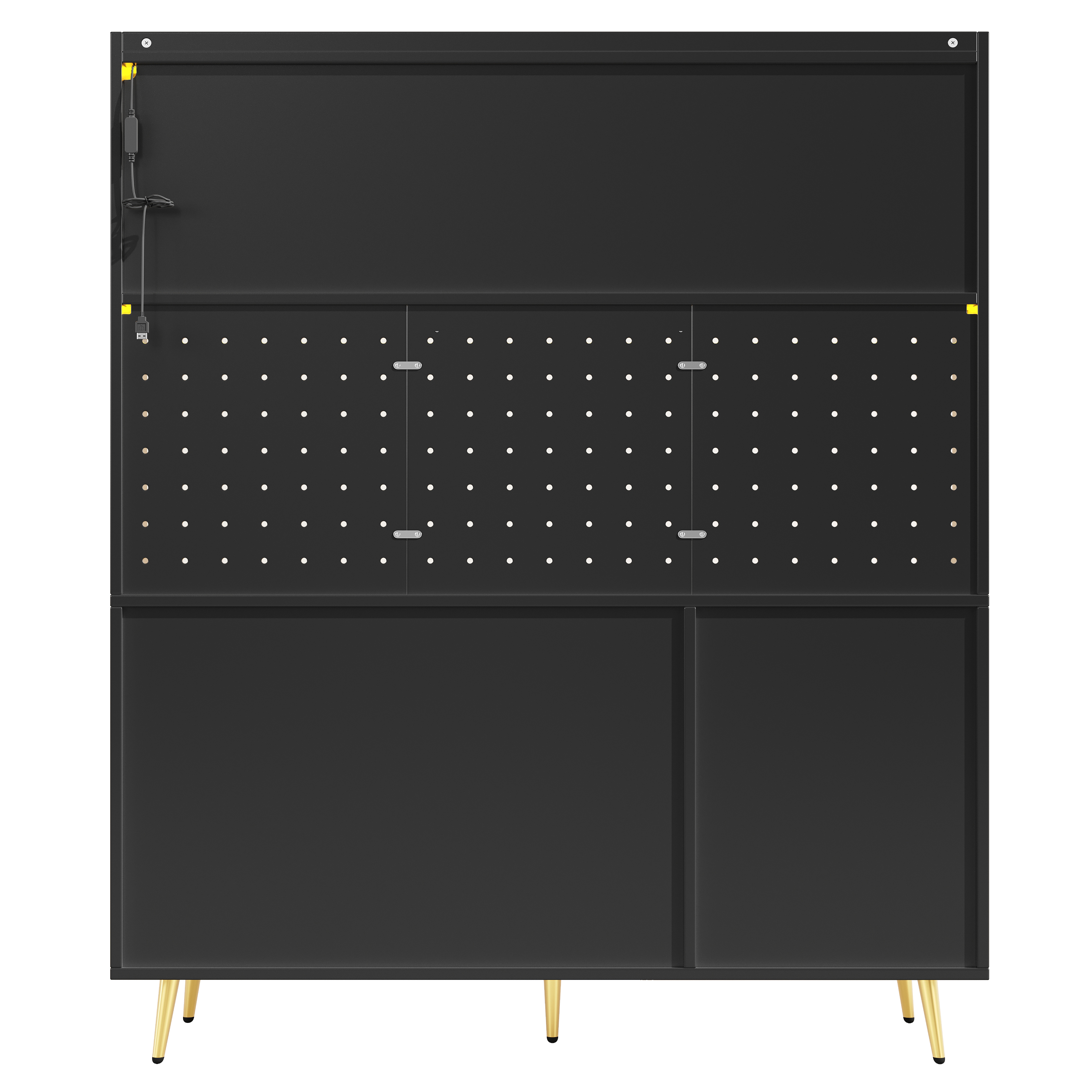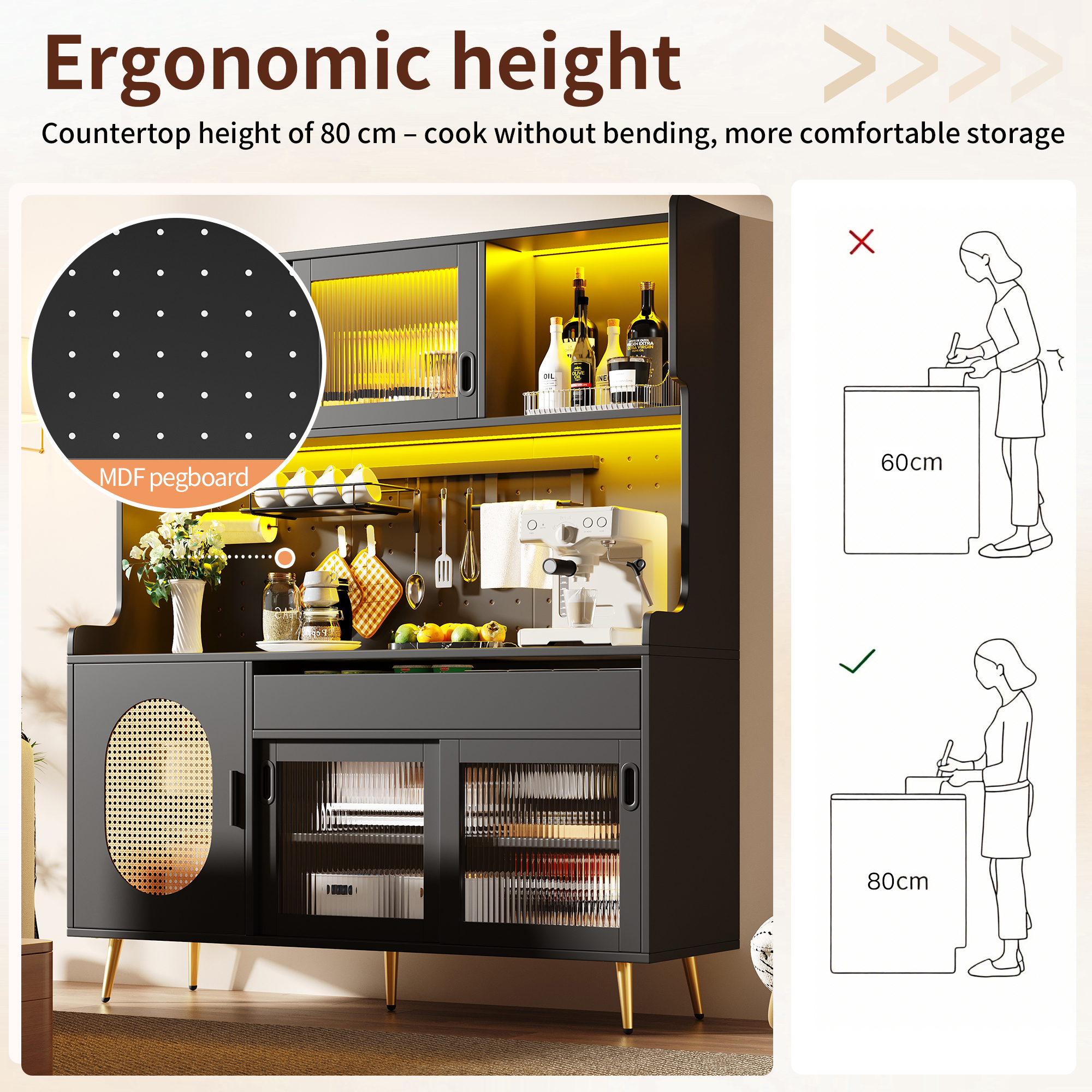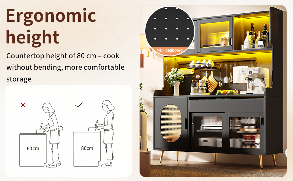 - Large Storage Capacity: Different storage options – independent cabinets, generous drawers, and a perforated pegboard on the back – fulfill various storage needs. The large, flat work surface has a practical height and is equally suitable for storing everyday utensils or displaying decorative items.