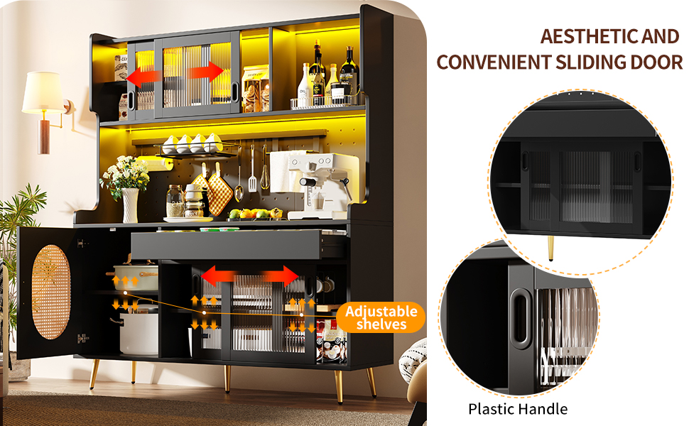 Sideboard Storage Cabinet Kitchen Cabinet Buffet, 145x39x171cm, Country Style, 5 Doors, With LED Light Strip & Pegboard, Fluted Glass Doors, Brown Black