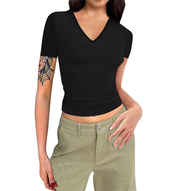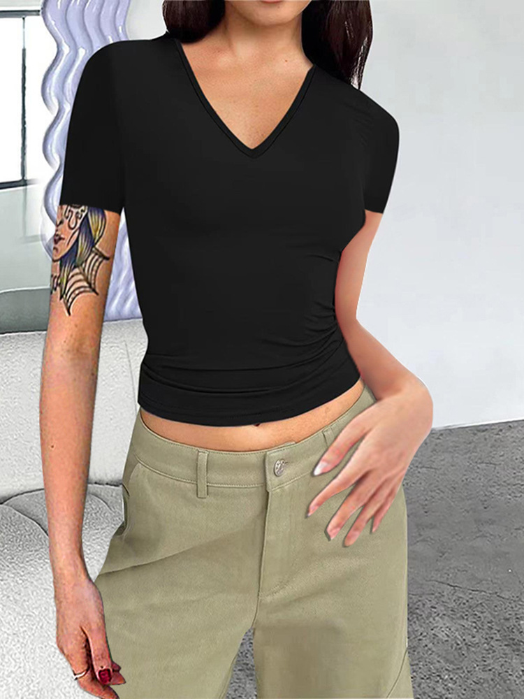 Solid-color V-neck Slim-fit Short-sleeve Crop Top