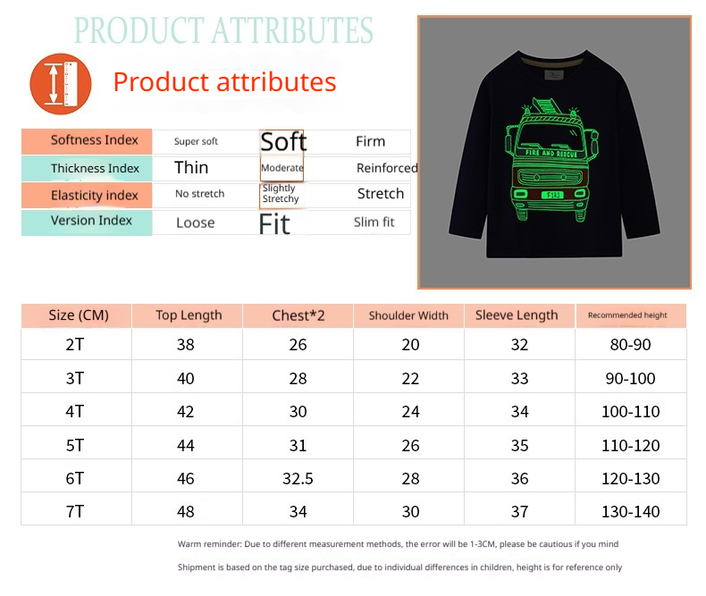 Suitable Height: 2T—80–90 cm; 3T—90–95 cm; 4T—95–100 cm; 5T—100–110 cm; 6T—110–120 cm; 7T—120–130 cm