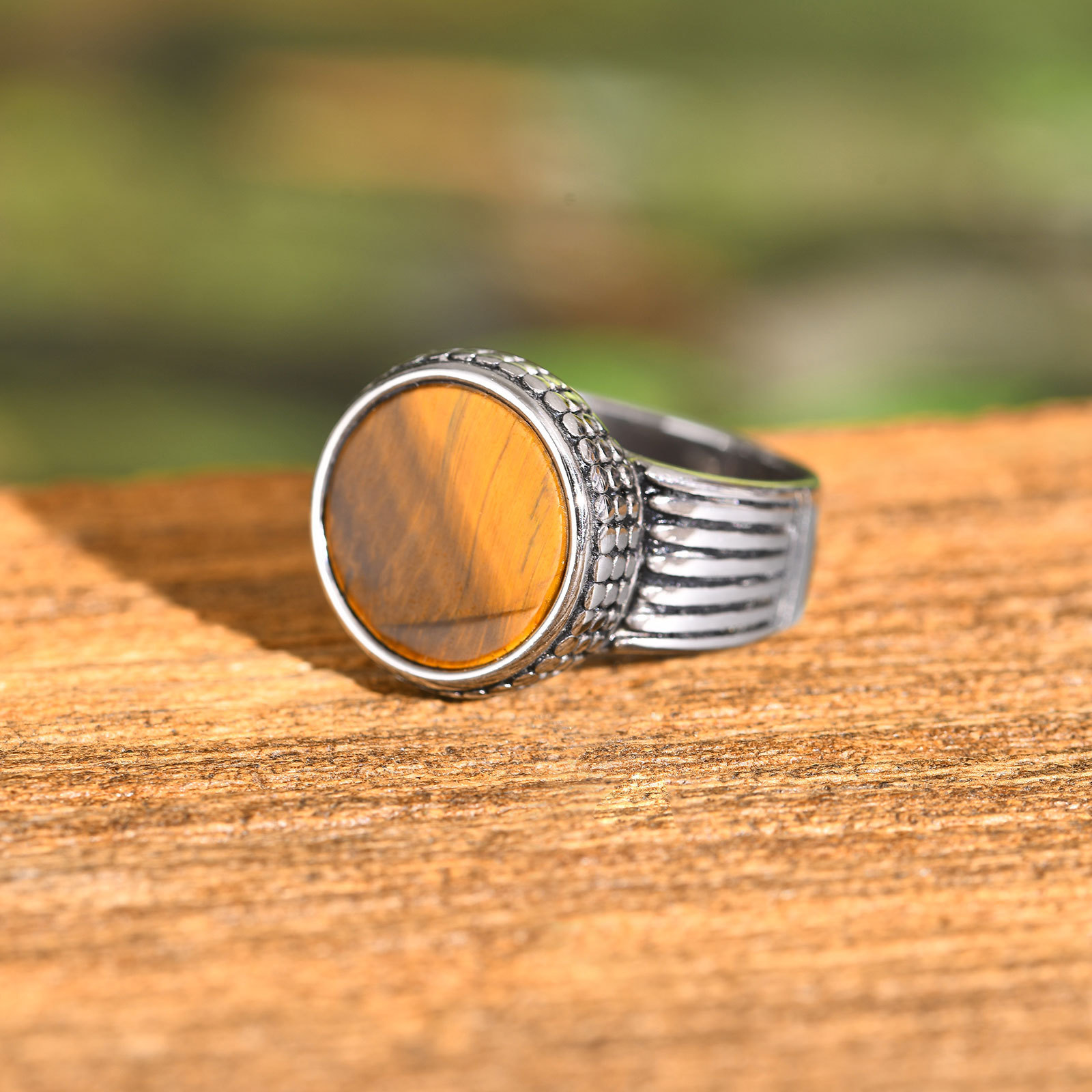 Stainless Steel Mens Tiger Eye Stone Cast Ring Vintage Style