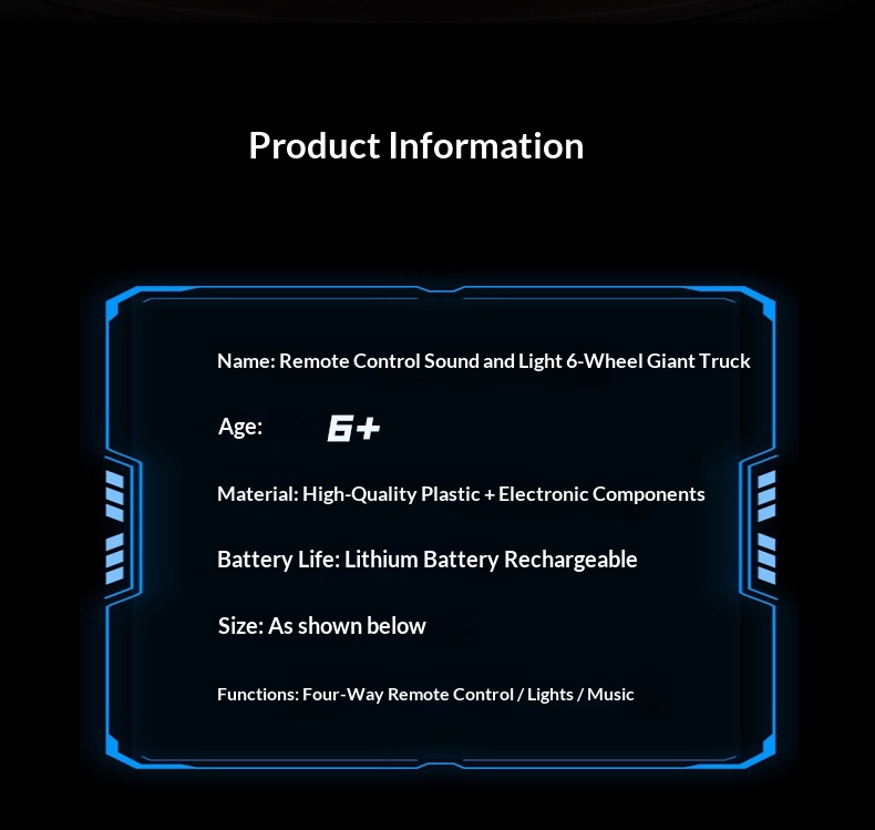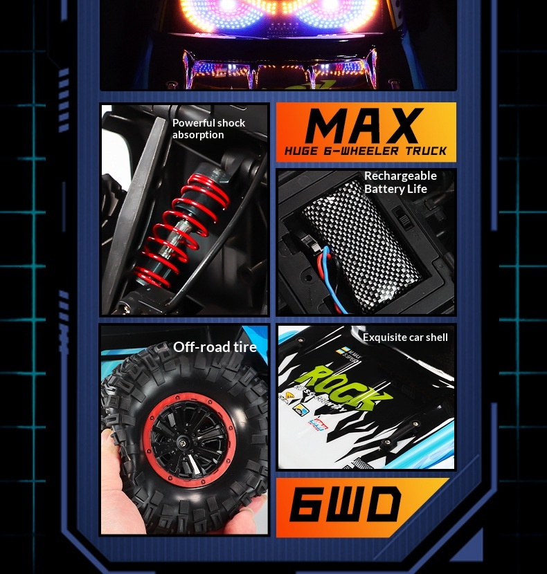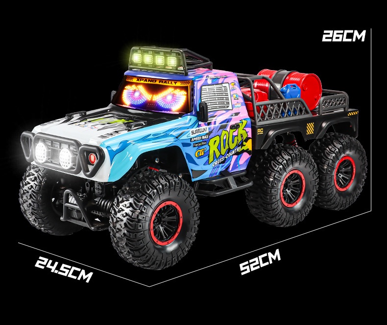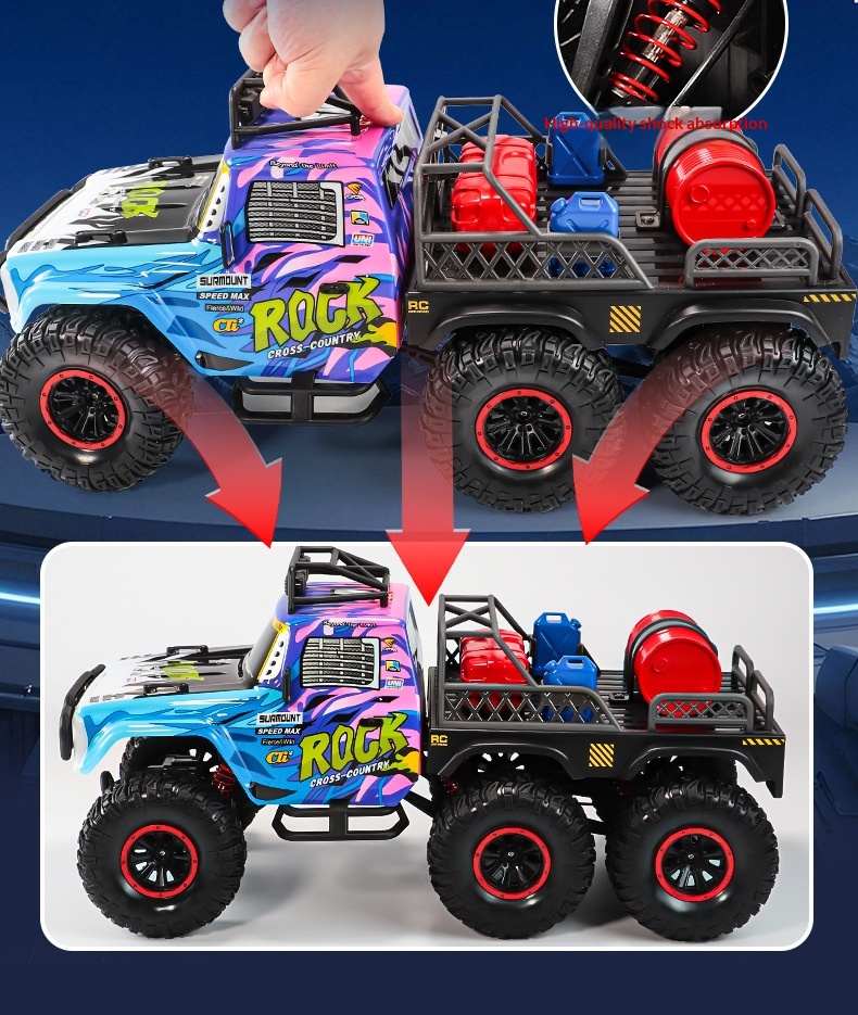 Colors: Six-wheel drive remote-controlled off-road vehicle in purple—with continuously variable transmission; six-wheel drive remote-controlled off-road vehicle in blue—with continuously variable transmission; six-wheel drive remote-controlled off-road vehicle in orange—with continuously variable transmission; four-wheel drive remote-controlled off-road vehicle in purple—with continuously variable transmission; four-wheel drive remote-controlled off-road vehicle in blue—with continuously variable transmission; four-wheel drive remote-controlled off-road vehicle in orange—with continuously variable transmission