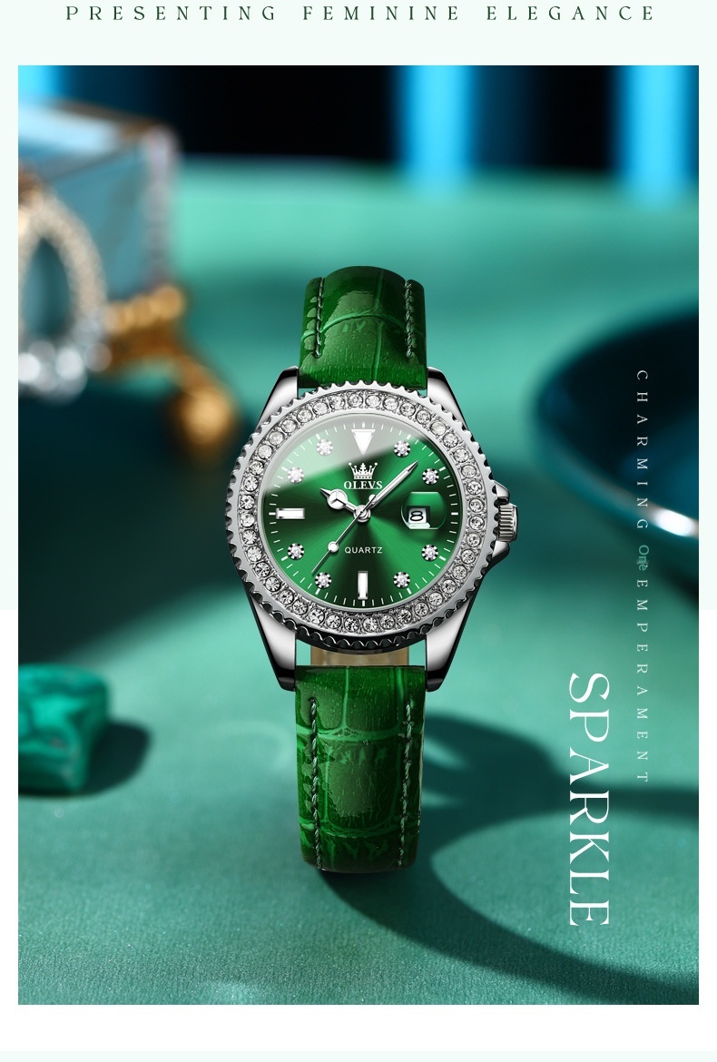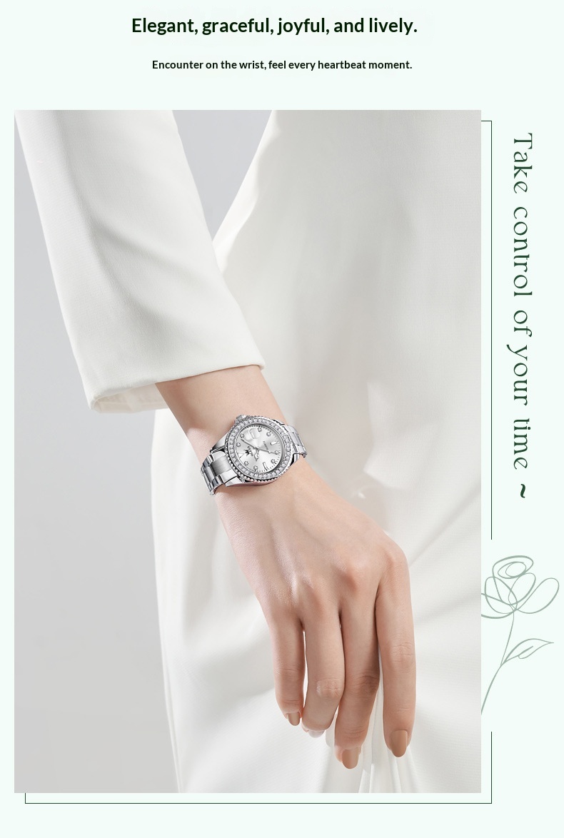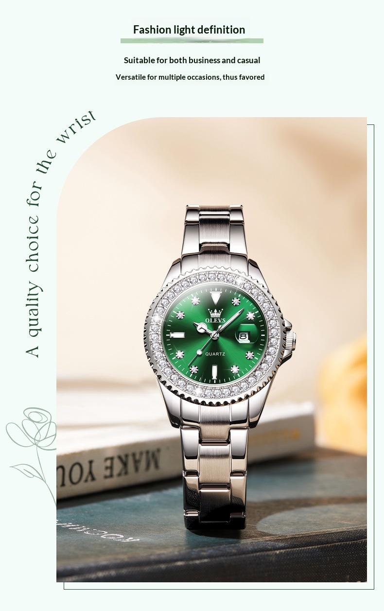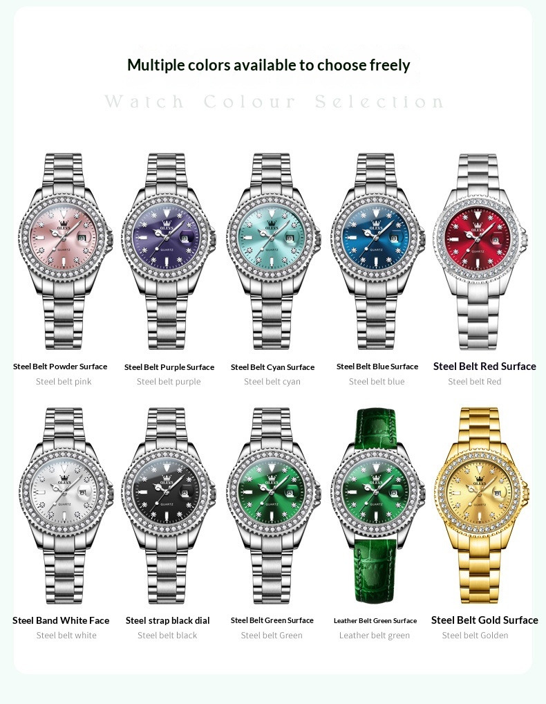 Colors: Li 9945 steel band natural white (women’s model), Li 9945 steel band natural green (women’s model), Li 9945 green leather strap natural green (women’s model), Li 9945 steel band pink (women’s model), Li 9945 steel band natural blue (women’s model), Li 9945 steel band light blue dial (women’s model), Li 9945 steel band natural black (women’s model), 9945 steel band purple dial (women’s model), Li Y9945 steel band bright red (women’s model)