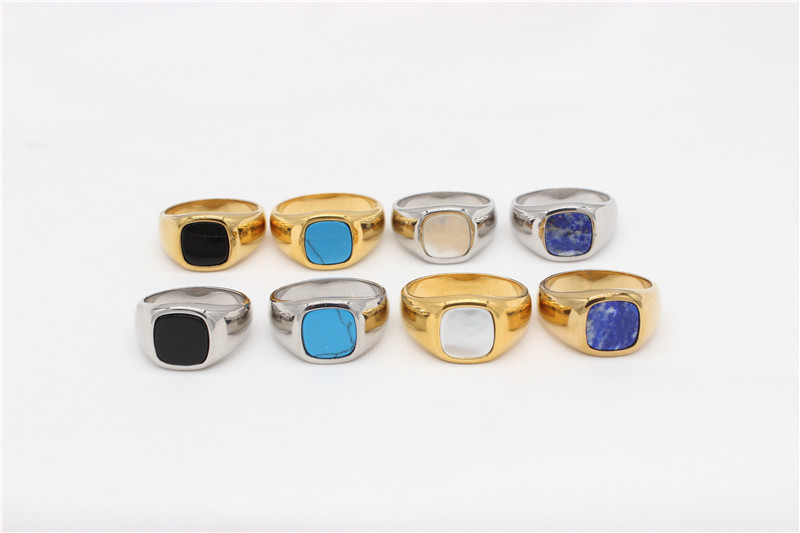 Product information:Type: Ring Processing Technique: Gold Plating Colors:Steel color with black stone,Steel color with white shell,Steel color with blue turquoise,Steel color with lapis lazuli,Gold co...