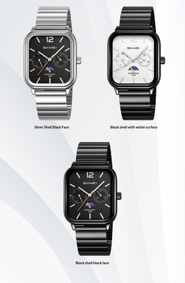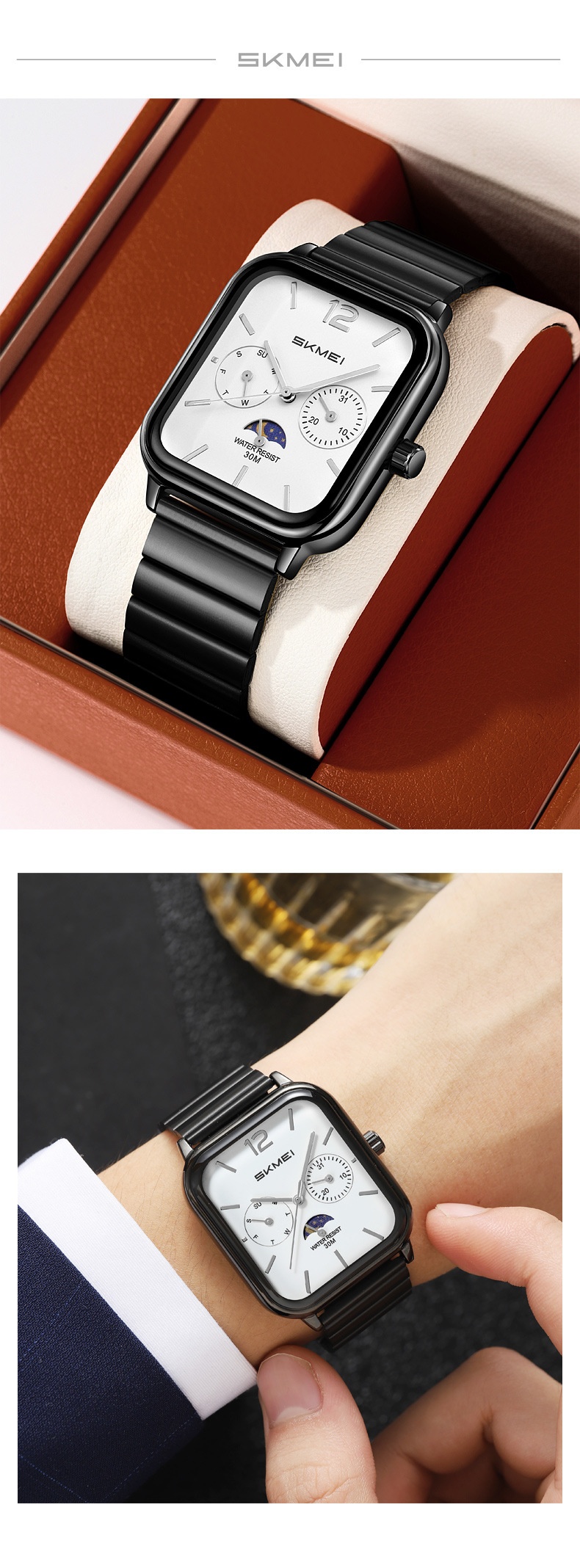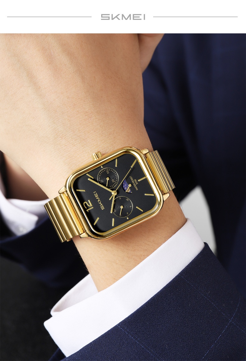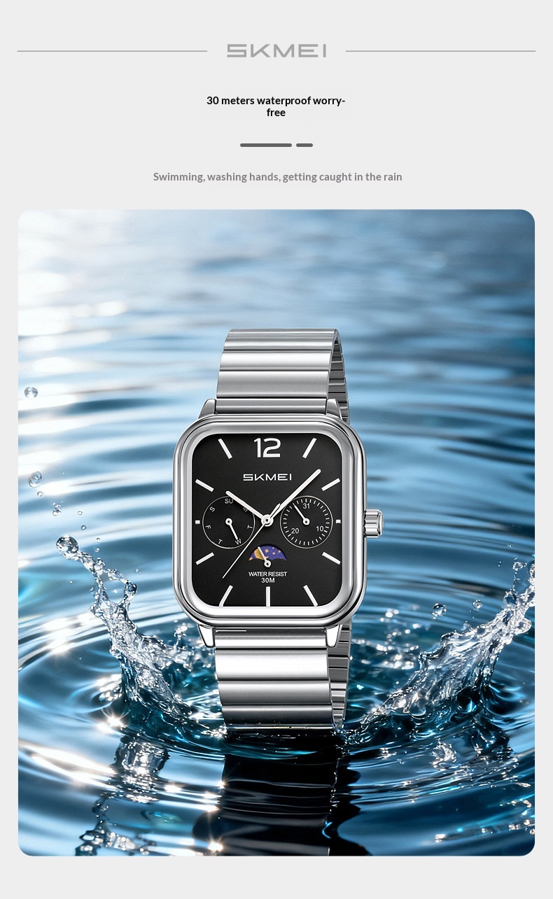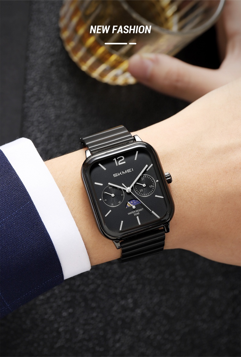 Stylish Multifunctional Square Watch With A Six-hand Moon Phase Display Designed For Business And Featuring Water Resistance