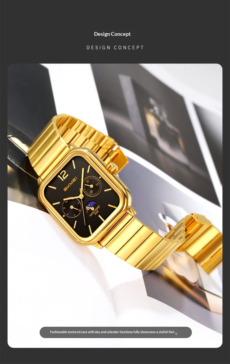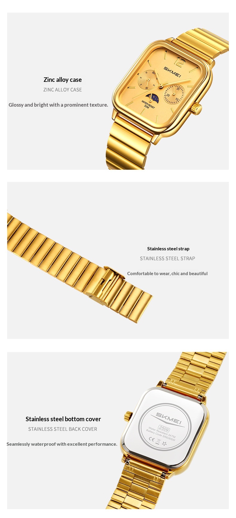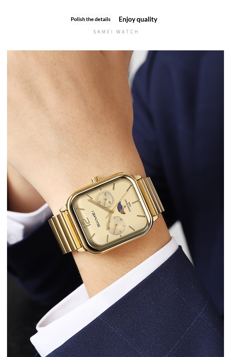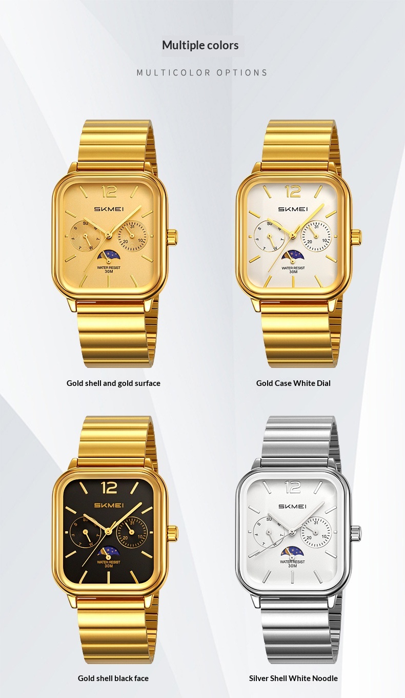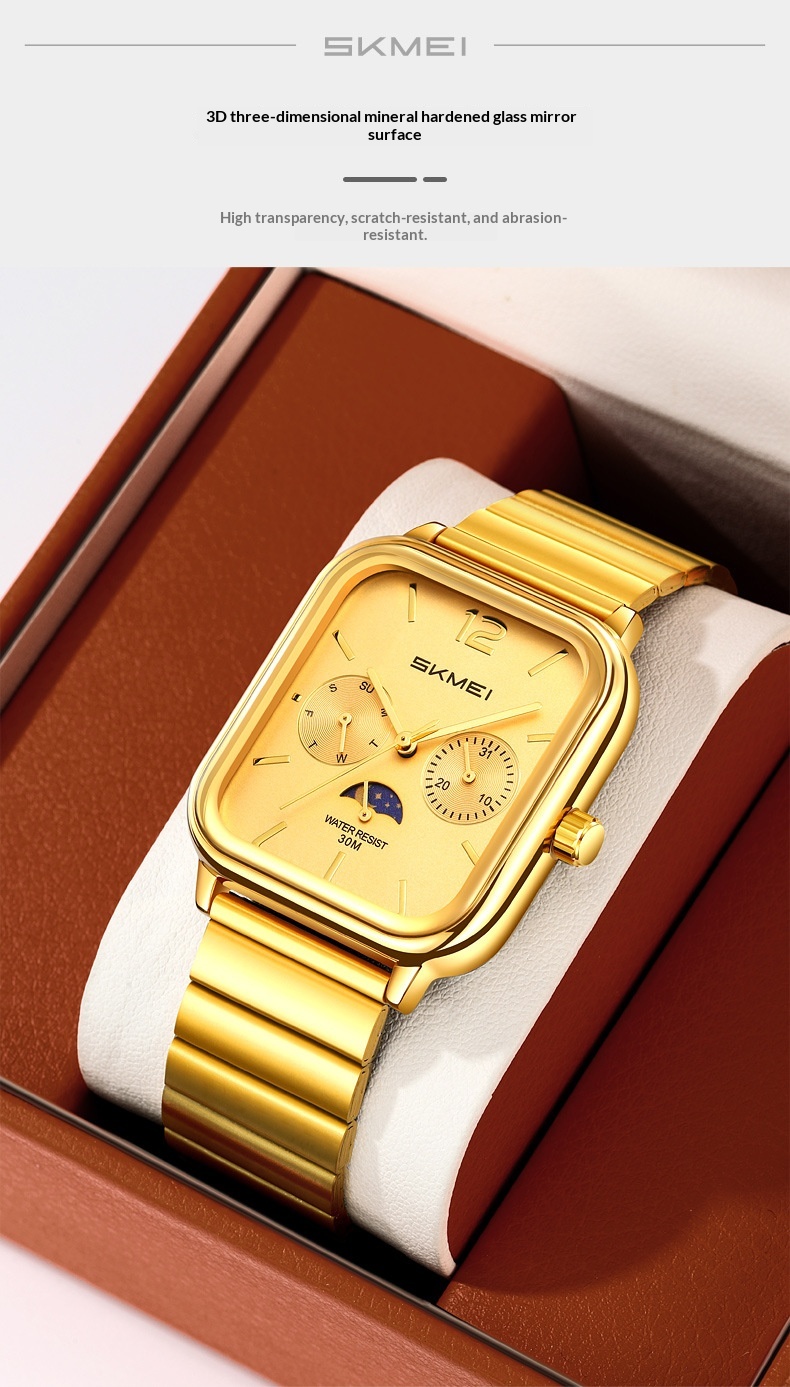 Stylish Multifunctional Square Watch With A Six-hand Moon Phase Display Designed For Business And Featuring Water Resistance