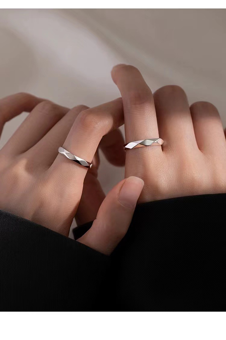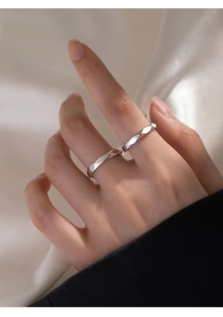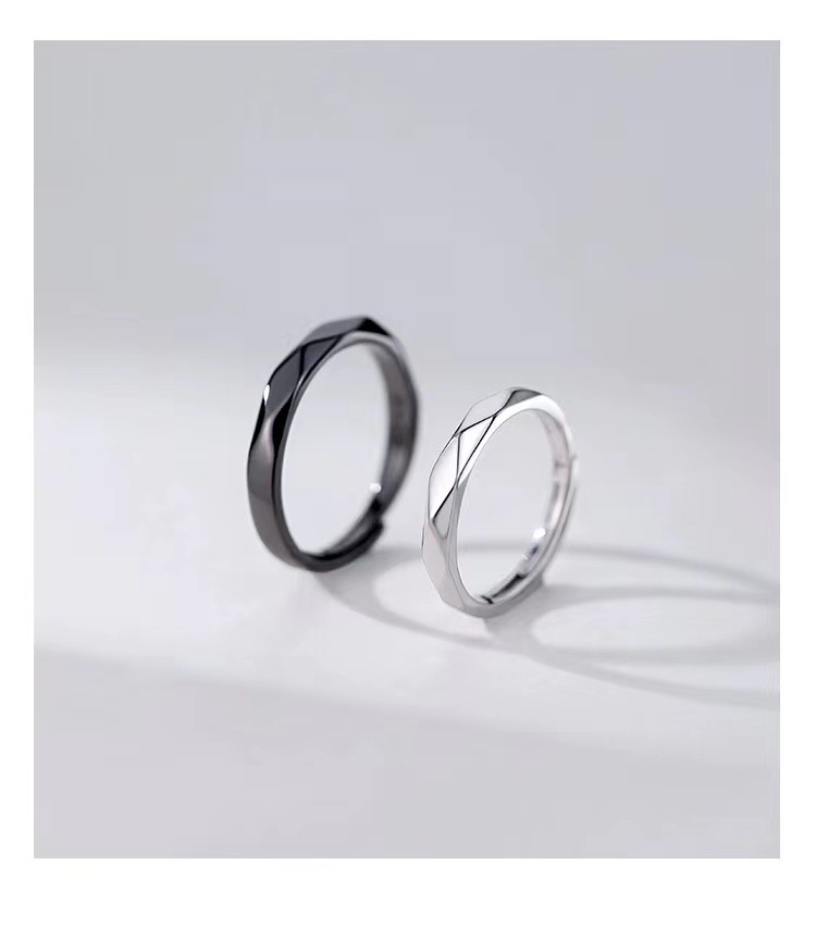 Color: Men’s black faceted ring, women’s silver faceted ring