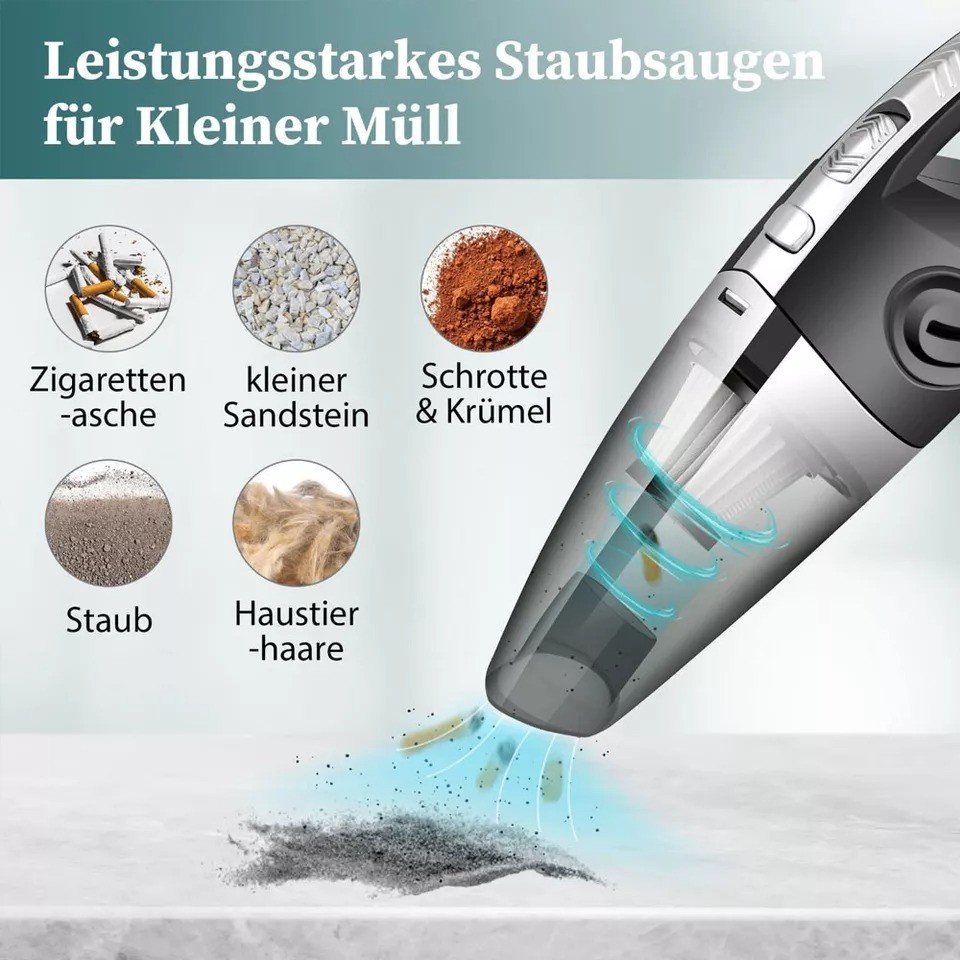 Produktspezifikationen Farbe: Wie abgebildet Länge: 34 cm Höhe: 11 cm Nennleistung: 120 Watt Netzkabellänge: ca. 1 Meter Vakuumdruck: 12.000 Pascal Nenndrehzahl: 32.000 U/min Akkukapazität: 2000 mAh Ladezeit: 1,5-2,5 Stunden Akkulaufzeit: 20-30 Minuten - Produktbeschreibung - Verbesserter HEPA-Filter: Dieser kabellose Staubsauger ist mit einem verbesserten HEPA-Filter und einem hochwertigen Nylonfilter ausgestattet. Dies verlängert die Lebensdauer des Filters, verhindert effektiv das Eindringen von Staub in die Antriebskomponenten und sorgt für optimale Saugleistung. - Rundumreinigung und multifunktionale Aufsätze: Dieser tragbare kabellose Staubsauger wird mit 5 funktionalen Aufsätzen geliefert, die sich zum Entfernen von Staub, Haaren, Krümeln, Sand, Tierhaaren und anderen Ablagerungen von Teppichen, Schreibtischen, Sofas, Tastaturen, Arbeitsplatten, Autositzen und mehr eignen. Die starke Saugleistung erfüllt Ihre täglichen Reinigungsanforderungen. - Superstarke Saugleistung: Dies ist eine verbesserte Version des bestehenden kabellosen Handstaubsaugers. Sein neuer Hochleistungsmotor bietet eine Saugleistung von 12.000 Pascal und entfernt mühelos Staub, Krümel, Katzenstreu, Tierhaare, verschüttete Milch und andere Flüssigkeiten. - Packungsinhalt: - 1 × Akku-Staubsauger - 1 × Filterpatrone - 2 × Zusatzanschlüsse - 1 × Bürstendüse - 1 × Flachdüse - 1 × Ausziehbarer Schlauch - 1 × Ladegerät (entspricht europäischen Normen) - 1 × Bedienungsanleitung - 1 × Verpackungskarton - Super-Akku & Schnellladung: Er nutzt die neueste Schnellladetechnologie und eine neue Generation wiederaufladbarer Lithium-Akkus. Er ist in nur 1,5–2 Stunden vollständig aufgeladen und hat eine Akkulaufzeit von bis zu 20–35 Minuten. Dieser kabellose Mini-Staubsauger ist kompakt und leicht zu transportieren und eignet sich daher perfekt für den Einsatz im Auto oder auf langen Reisen mit begrenztem Platzangebot. Produktspezifikationen - Farbe: Wie abgebildet - Länge: 34 cm - Höhe: 11 cm - Nennleistung: 120 Watt - Netzkabellänge: ca. 1 Meter - Vakuumdruck: 12.000 Pascal - Nenndrehzahl: 32.000 U/min - Akkukapazität: 2000 mAh - Ladezeit: 1,5–2,5 Stunden - Akkulaufzeit: 20–30 Minuten