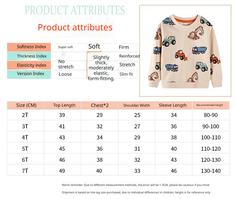 Suitable Height: 2T recommended for 80–90 cm, 3T for 90–95 cm, 4T for 95–100 cm, 5T for 100–110 cm, 6T for 110–120 cm, 7T for 120–130 cm.