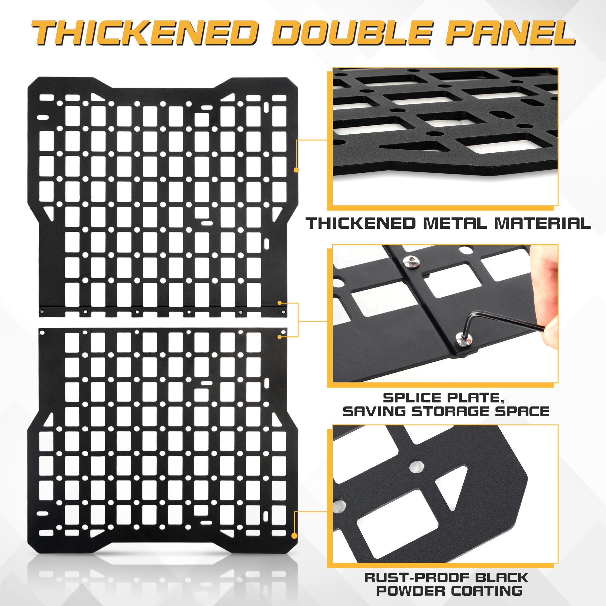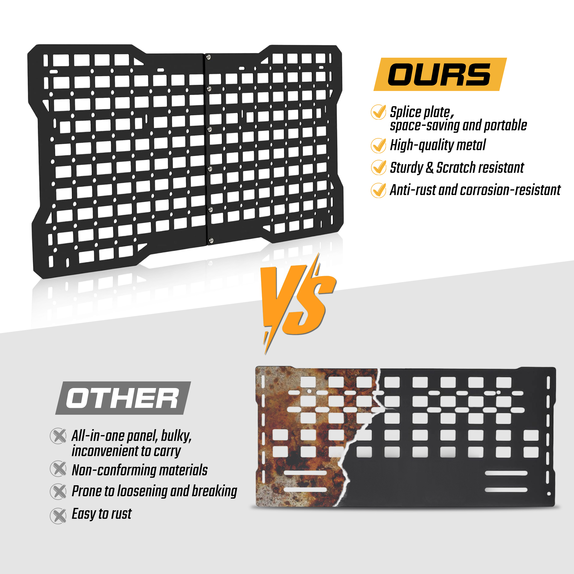 - 【MOLLE System】The MOLLE Panel allows storage in unused side space; Reliable mounting solution for your off-road tools: fuel tank,molle bags, trail gear, high lift jacks, hunting gear, fishing equipment or shovels.