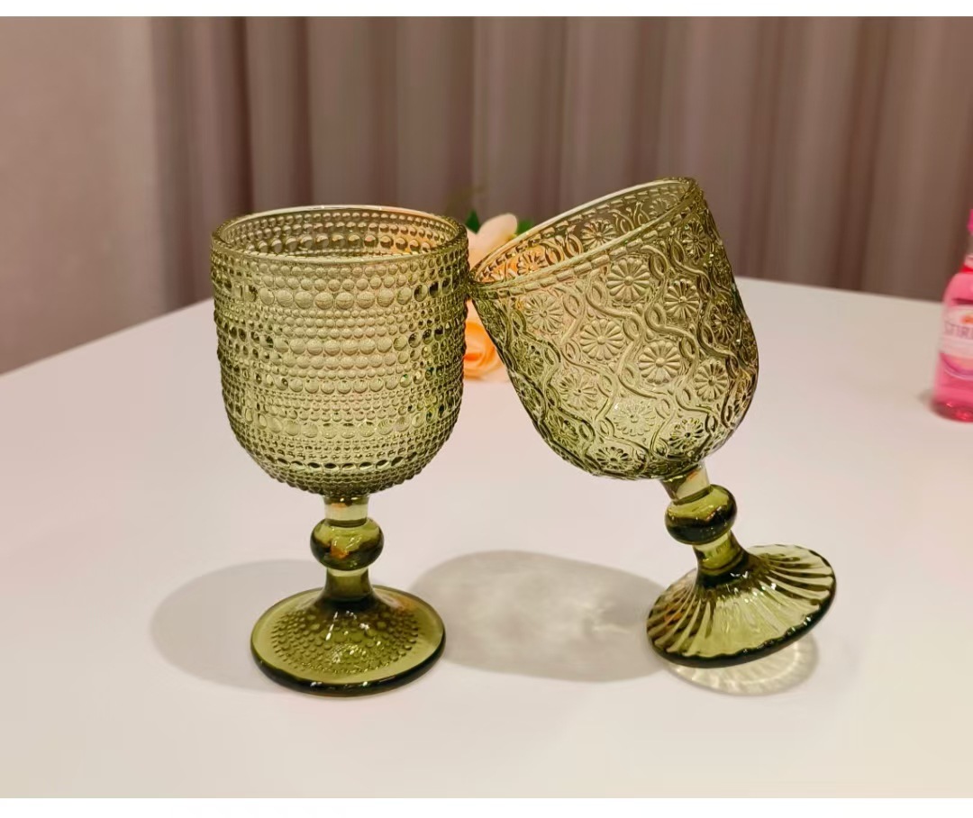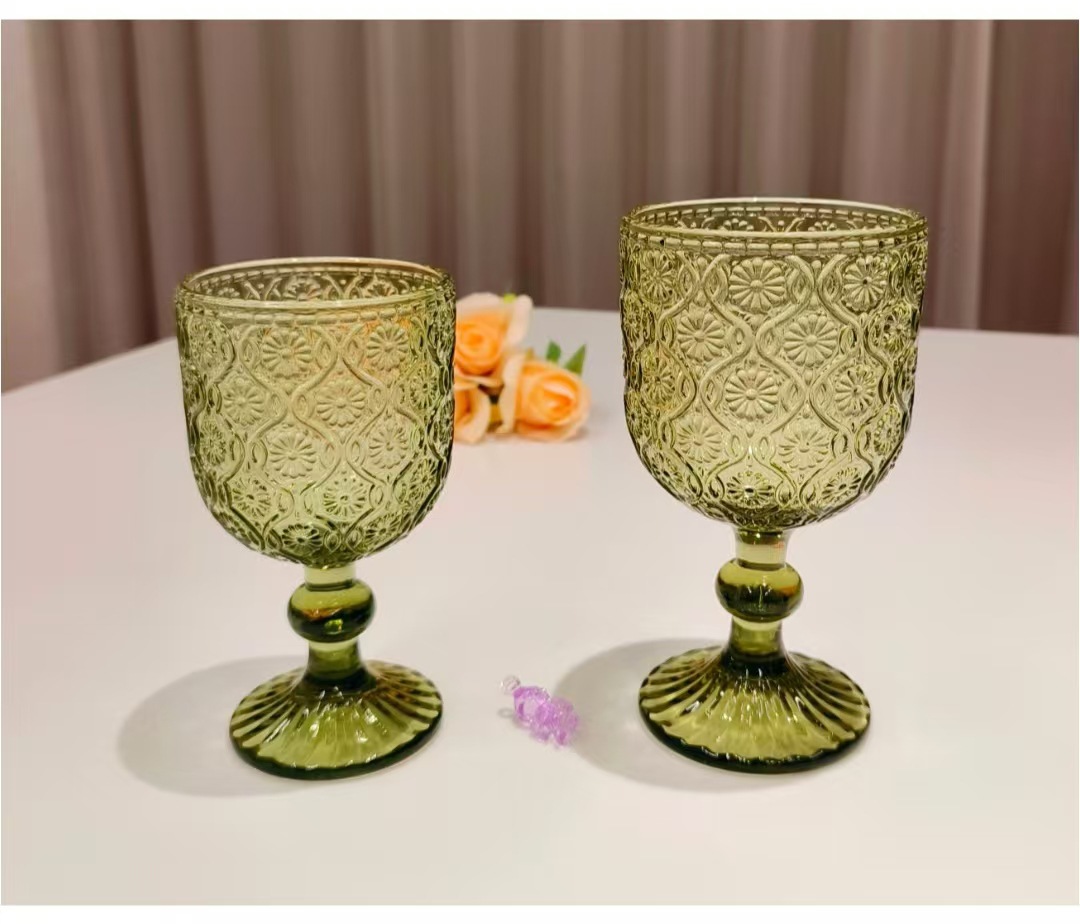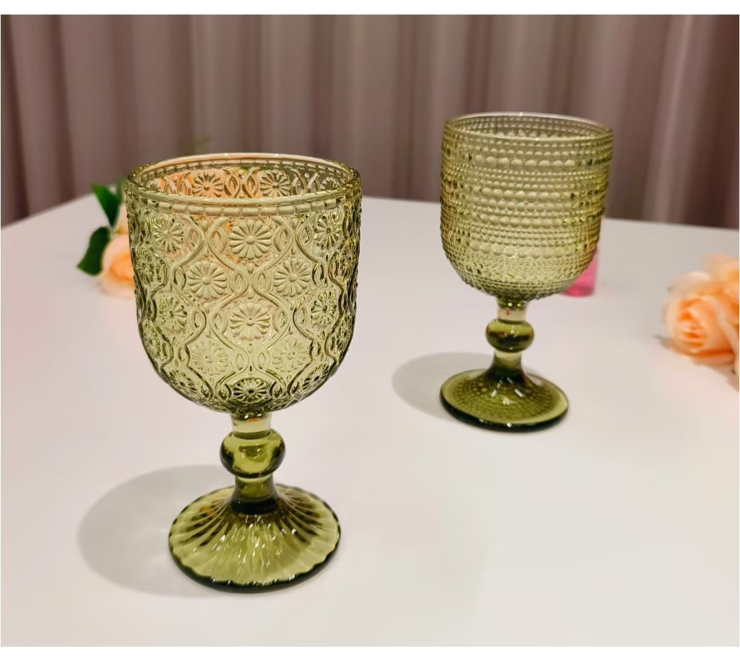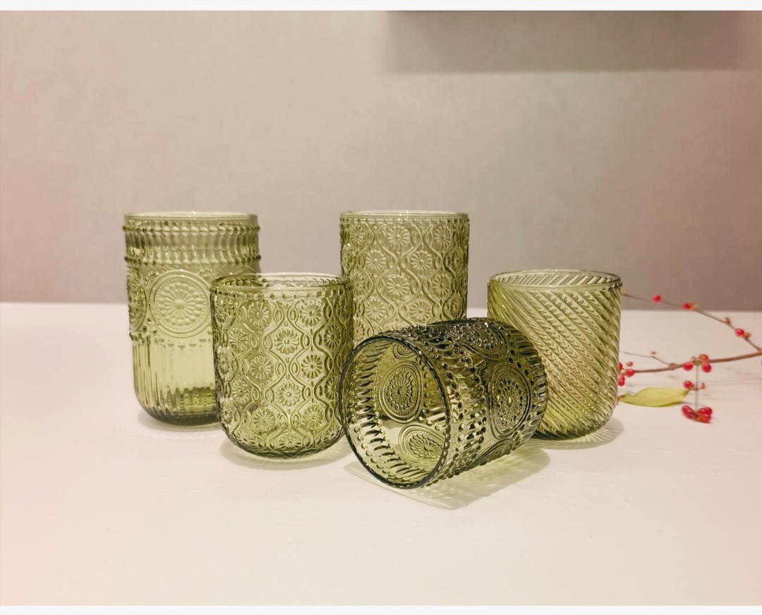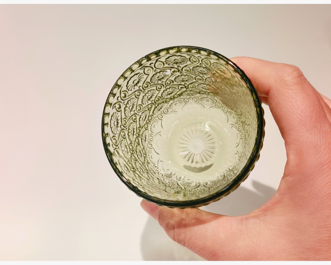 Colors: Green sunflower shot glass, 250 ml; green herringbone shot glass, 250 ml; green crabapple flower shot glass, 250 ml; green polka-dot shot glass, 250 ml; green sunflower wine glass, 350 ml; green herringbone wine glass, 350 ml; green crabapple flower wine glass, 350 ml; green polka-dot wine glass, 350 ml; green sunflower small-mouth cup, 260 ml; green herringbone small-mouth cup, 260 ml; green crabapple flower small-mouth cup, 260 ml; green polka-dot small-mouth cup, 260 ml; green sunflower large-mouth cup, 410 ml; green herringbone large-mouth cup, 410 ml; green crabapple flower large-mouth cup, 410 ml; green polka-dot large-mouth cup, 410 ml.