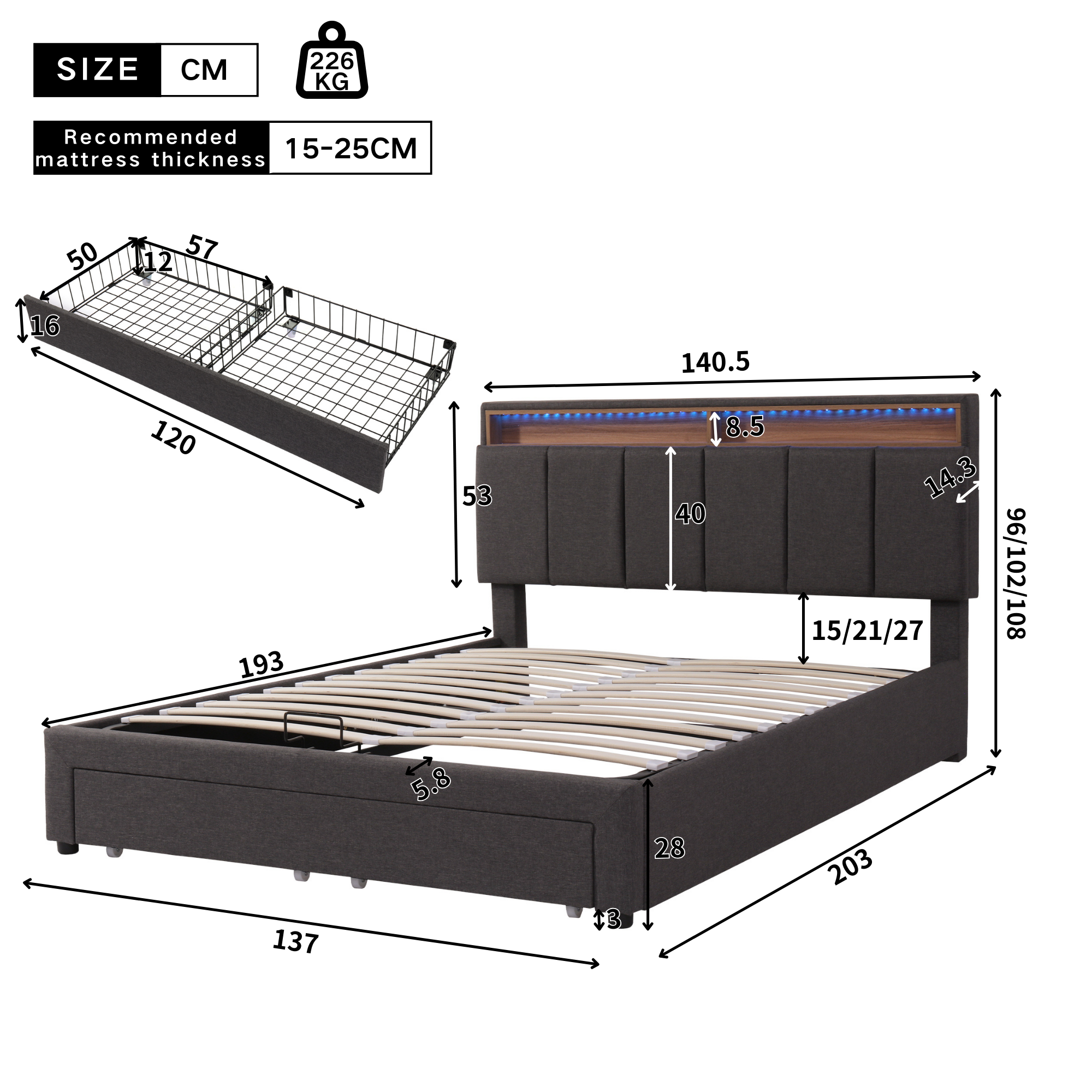 SpecificationProduct InformationProduct Type :Combo ItemProduct Name:Upholstered bed with LED lighting, double bed-4ft6 (135*190cm), hydraulic storage bed with bed box, drawers and storage compartment...