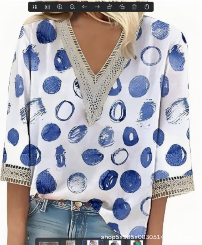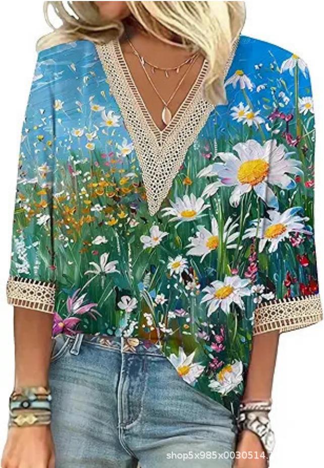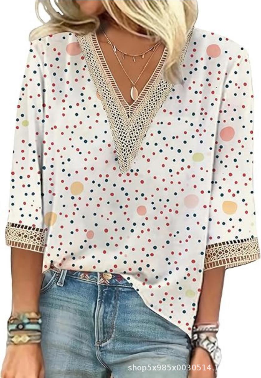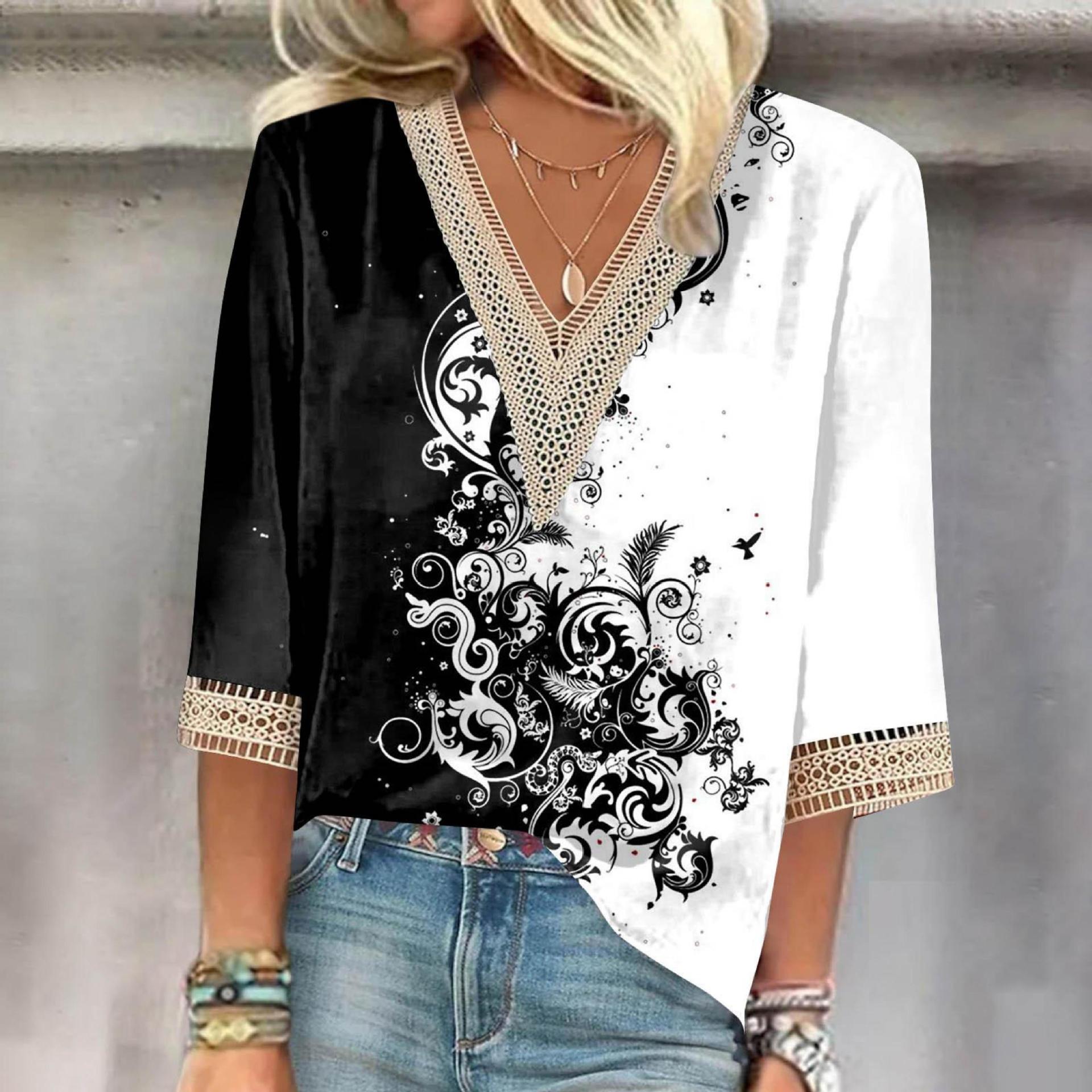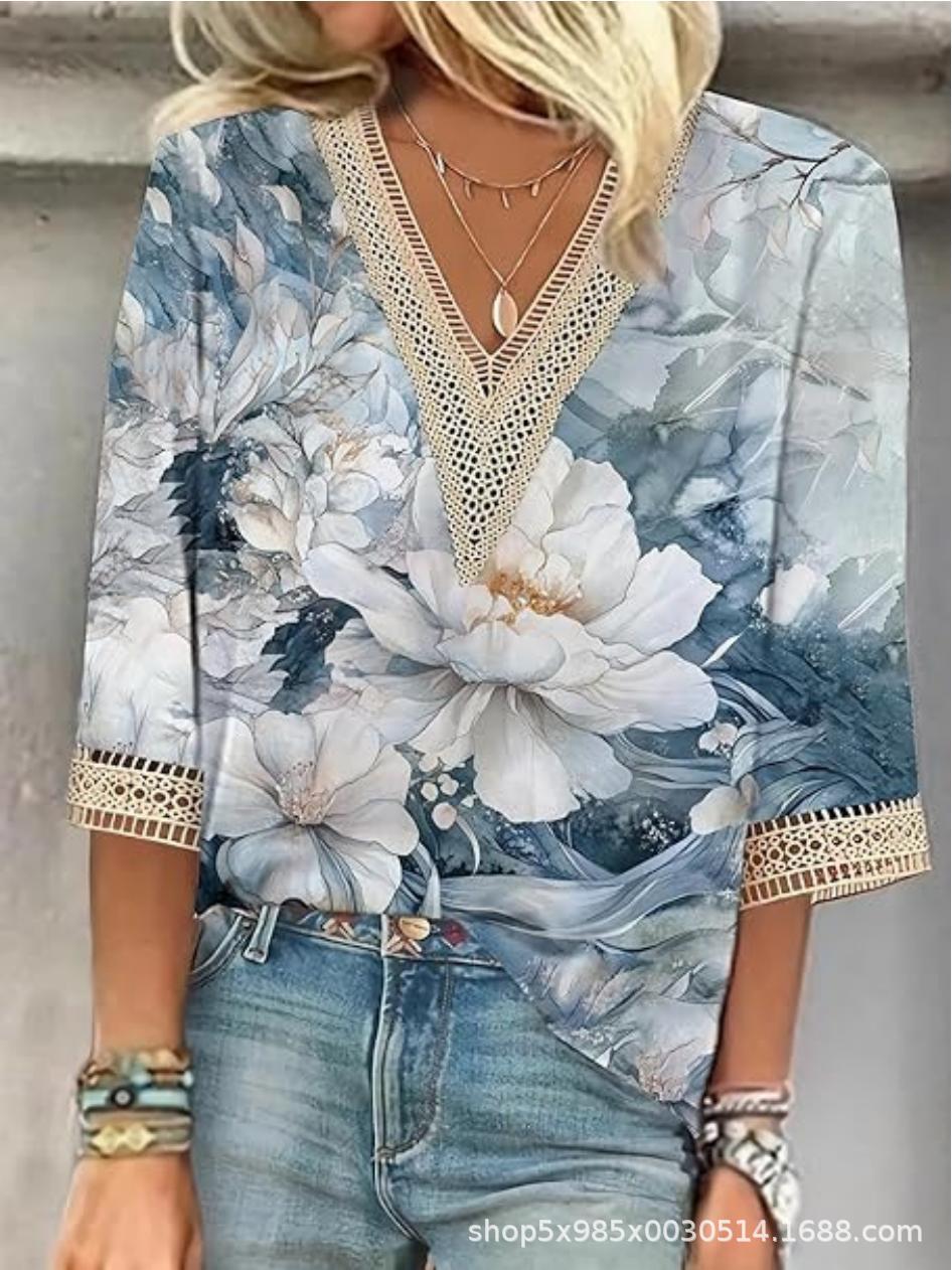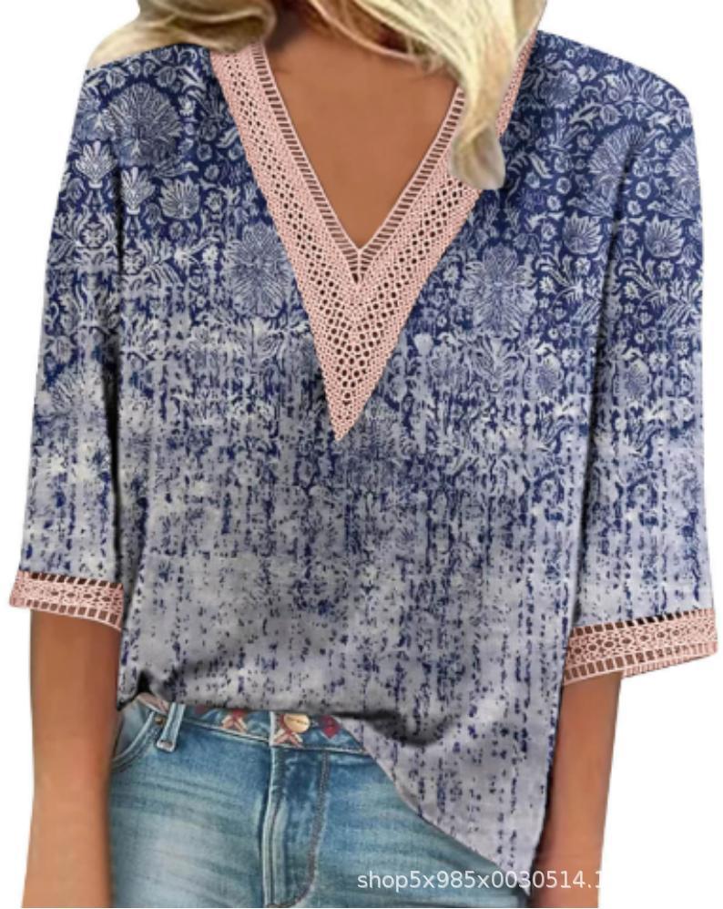 V-neck Lace-trimmed Printed Loose-fit Blouse Top