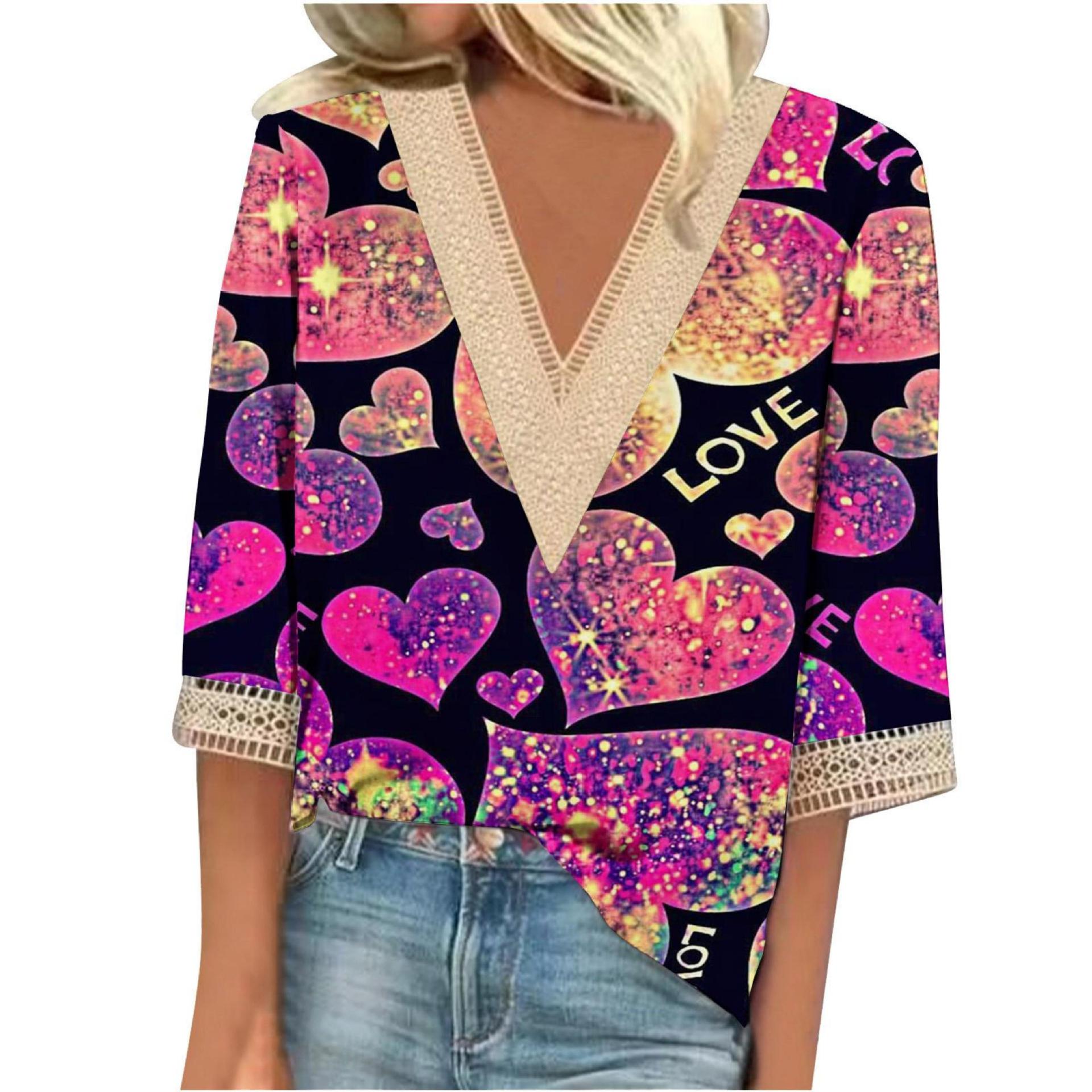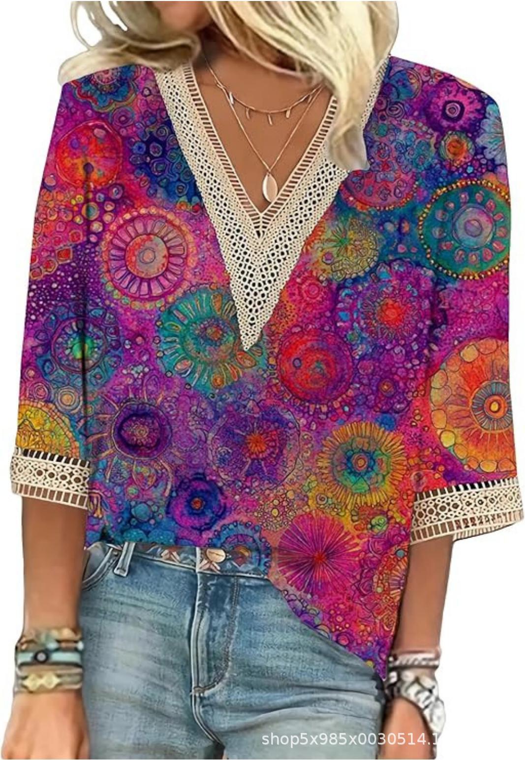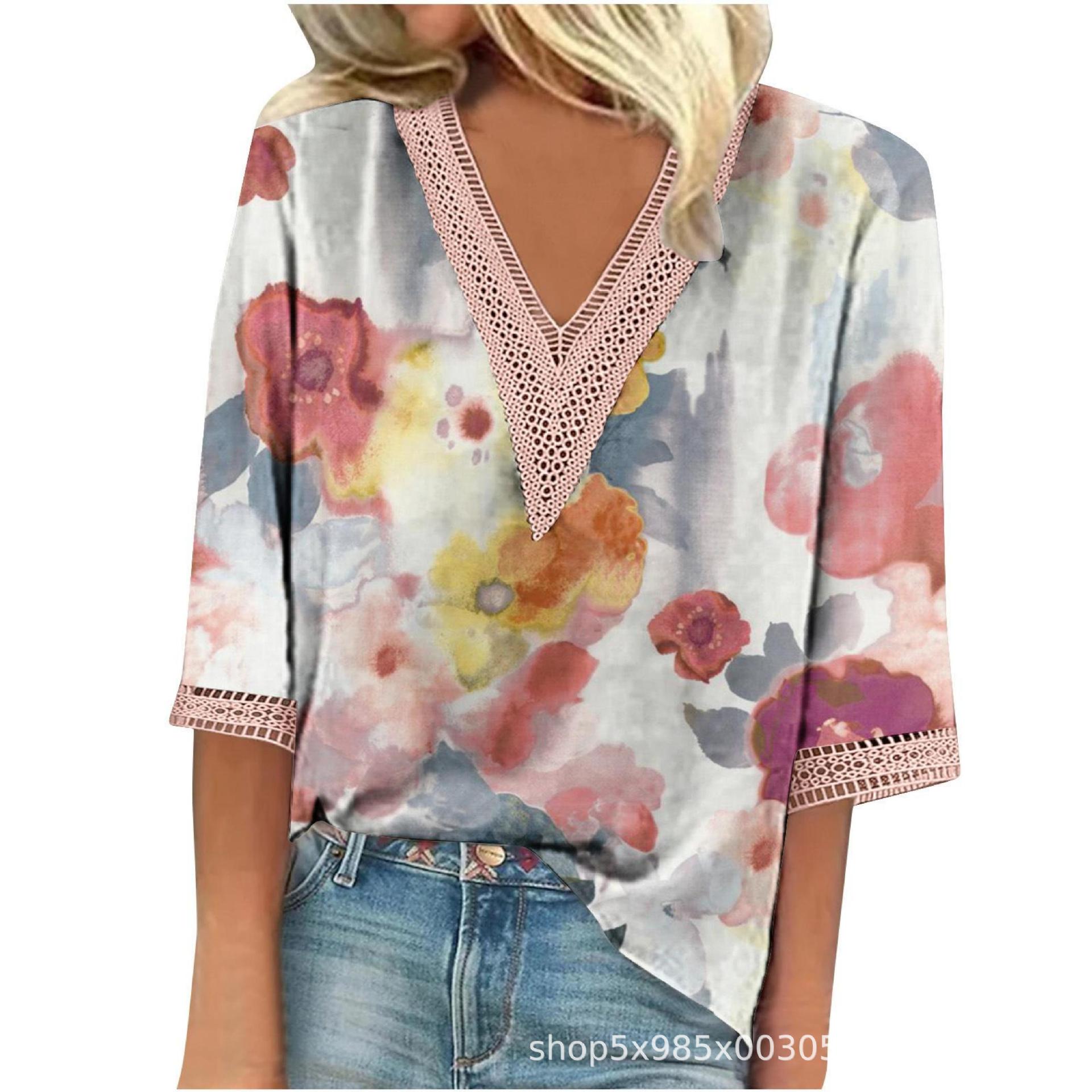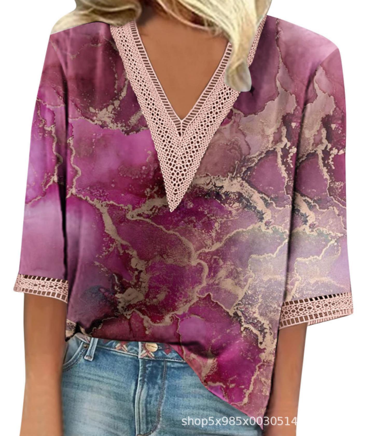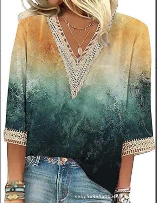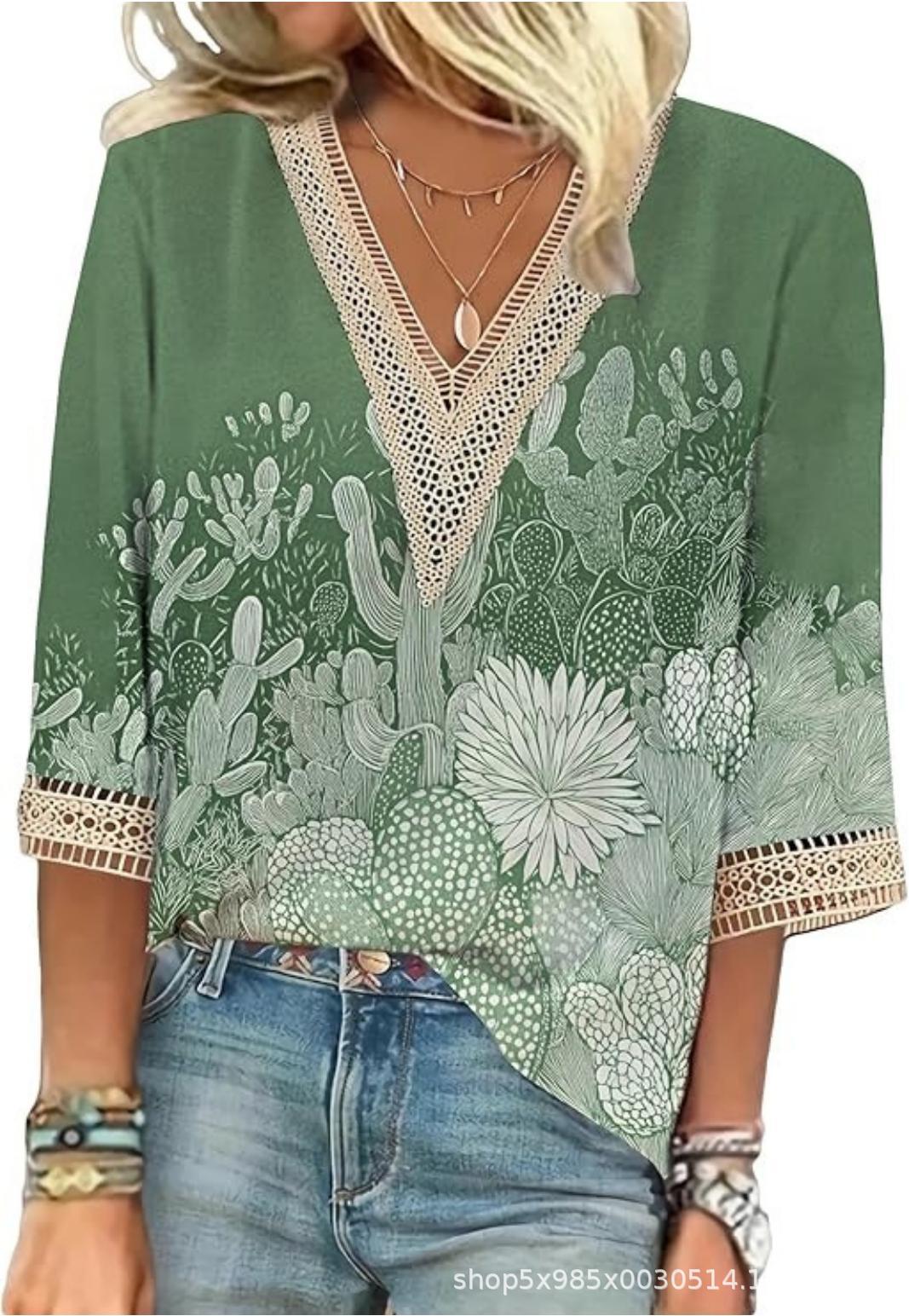V-neck Lace-trimmed Printed Loose-fit Blouse Top