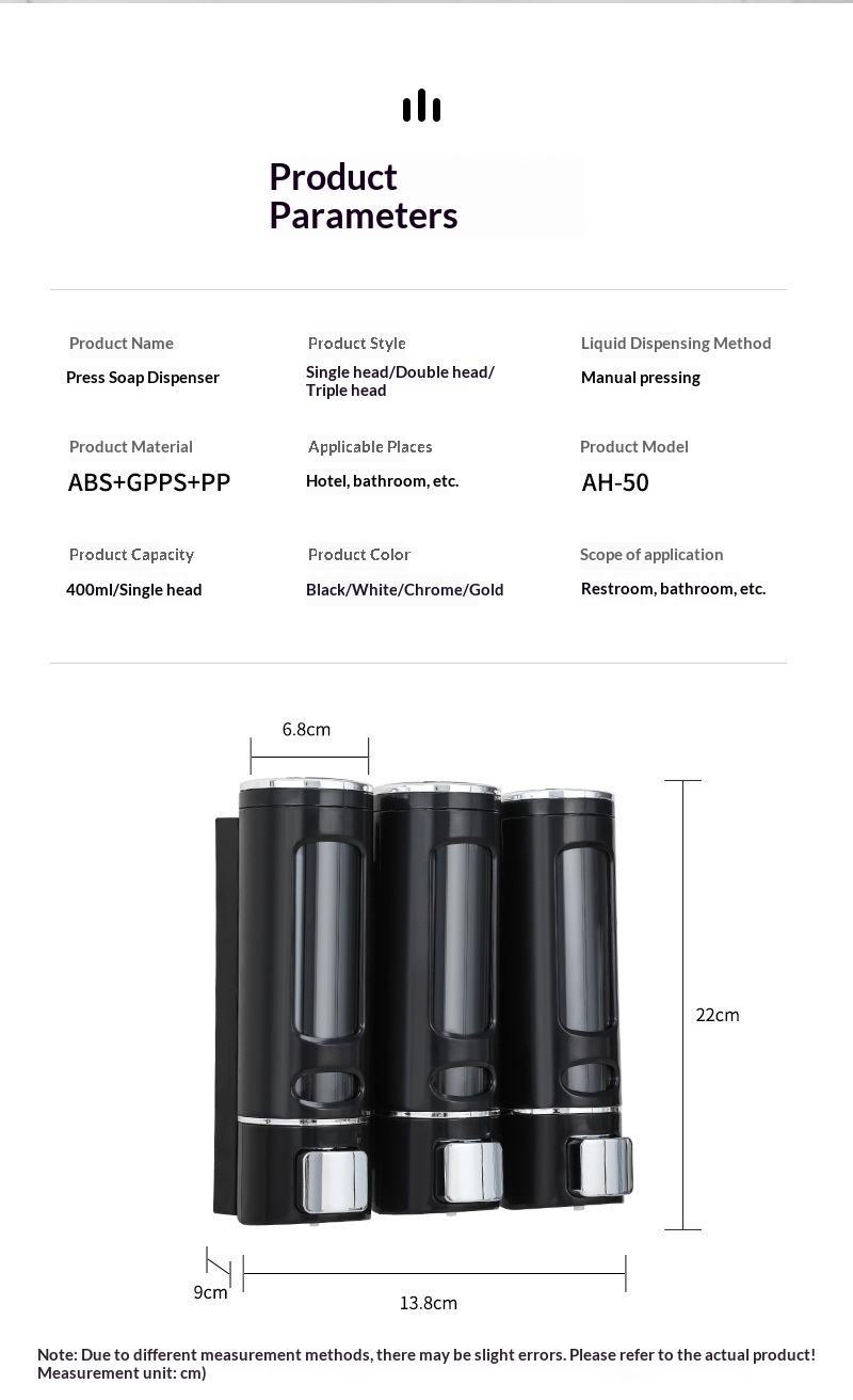 Specifications: 50 black soap dispenser – 400 ml, single-head screw model; 50 black soap dispenser – 400 ml, double-head screw model