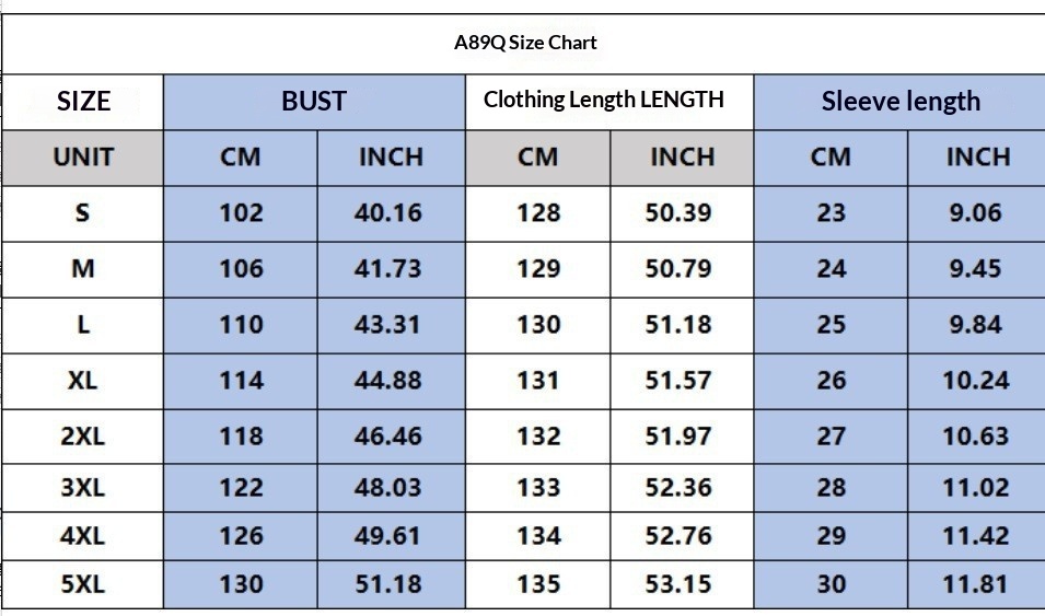 Sizes: S, M, L, XL, 2XL, 3XL, 4XL, 5XL