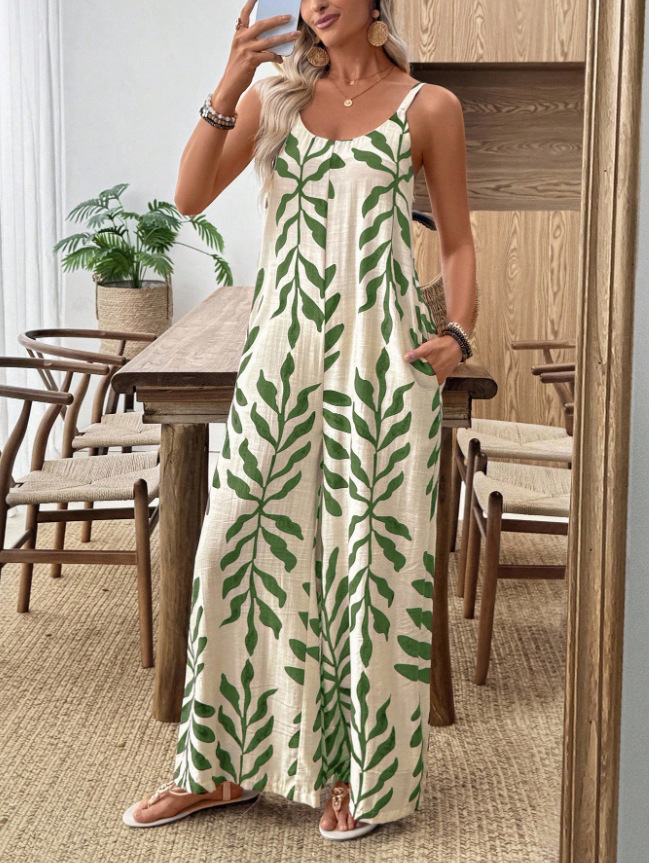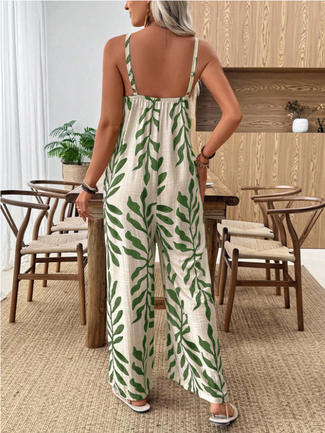 Womens Casual & Elegant V-Neck Jumpsuit With Tropical Leaf Print And Pockets For Women