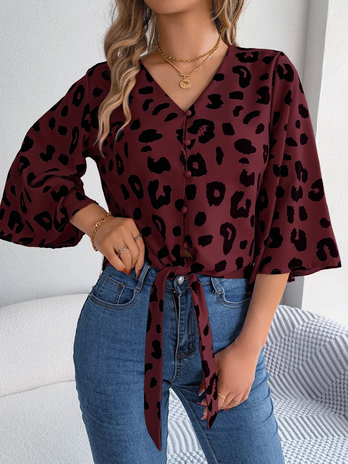 Product information:Color: Khaki, Burgundy, White Size: S, M, L, XL Trendy Element: Lace-up Details Fabric Name: Polyester Sleeve Style: Flared Sleeve Sleeve Length: Three-Quarter Sleeve Style: Europe...