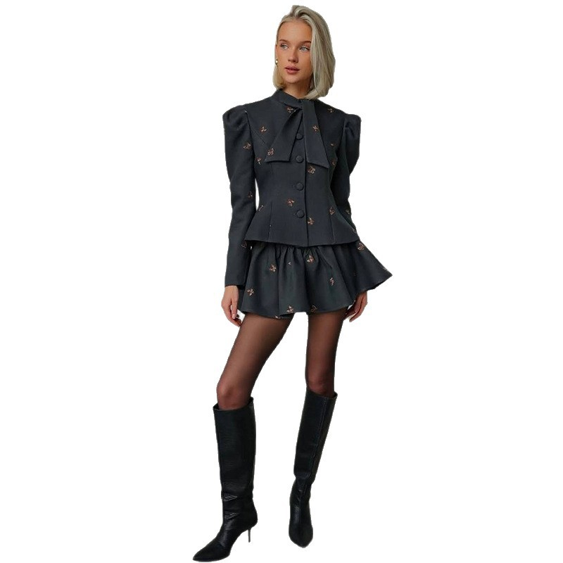 Womens Elegant Gray Commuter Dress Set With Floral Print And Long Sleeves
