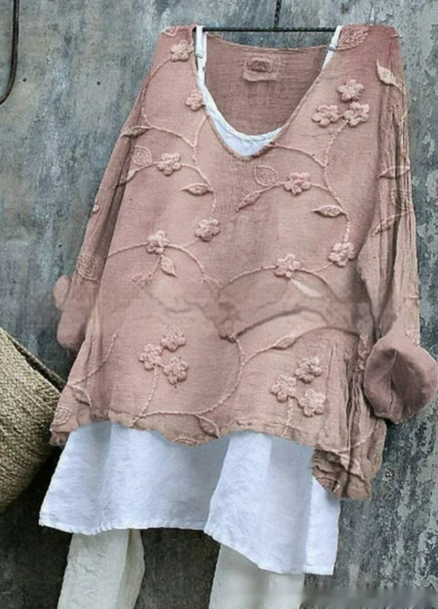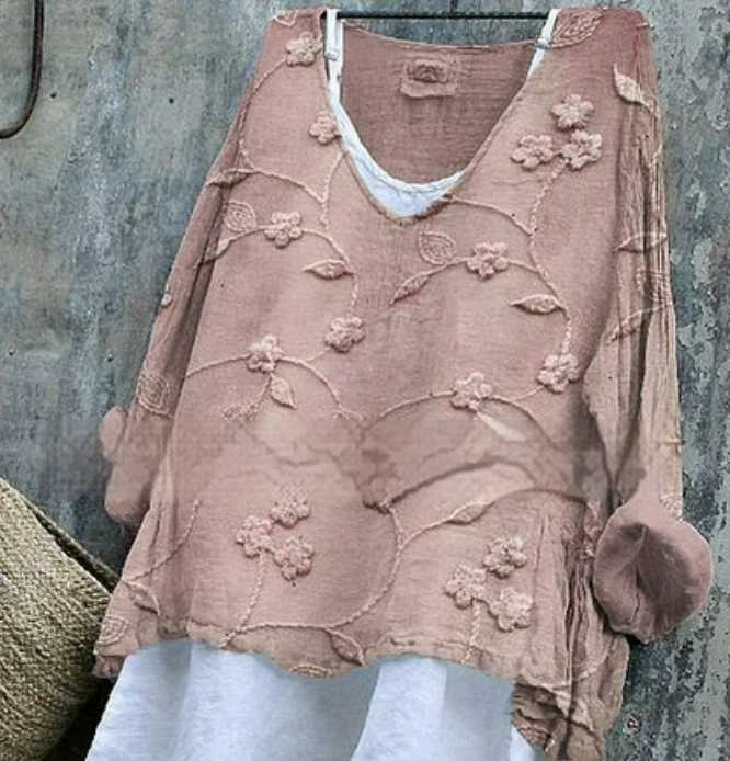 Womens Embroidered Loose Linen Top With Long Sleeves