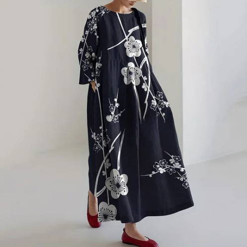 Womens Fashion Round-Neck Printed Long-Sleeve Dress