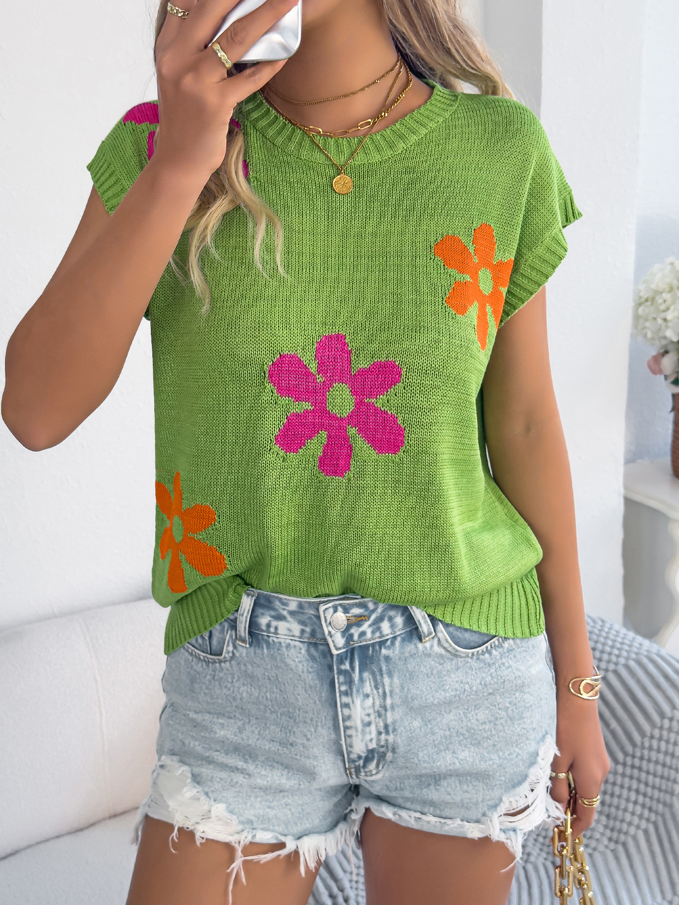 Womens Fashionable Floral Casual Loose Batwing-Sleeve Knit Top