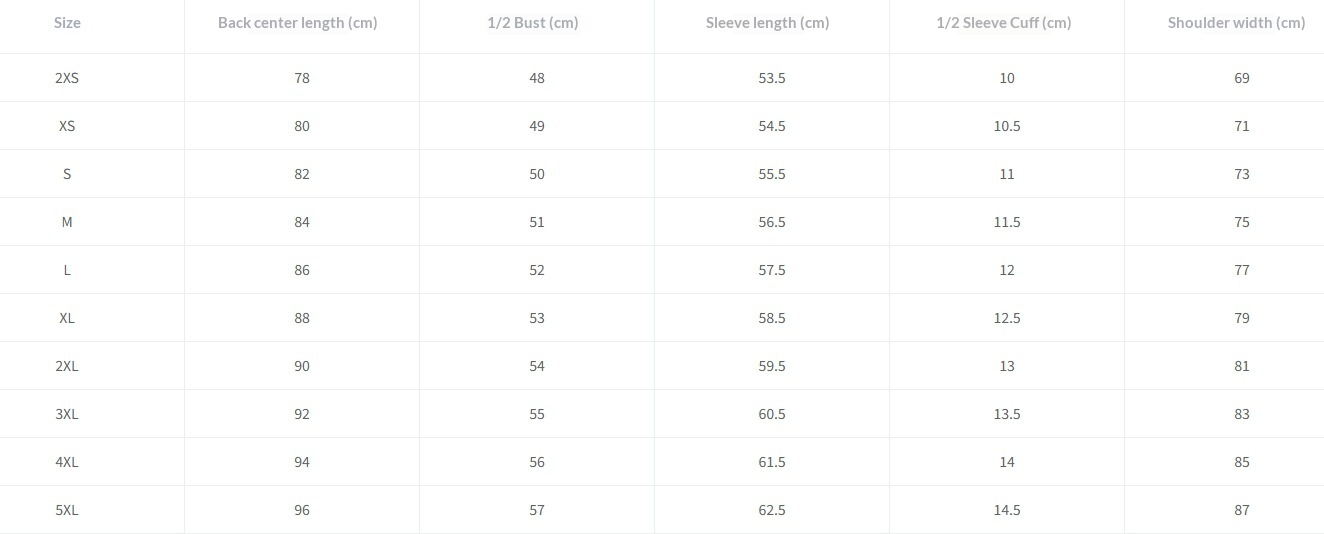 Sizes: XXS, XS, S, M, L, XL, 2XL, 3XL, 4XL, 5XL