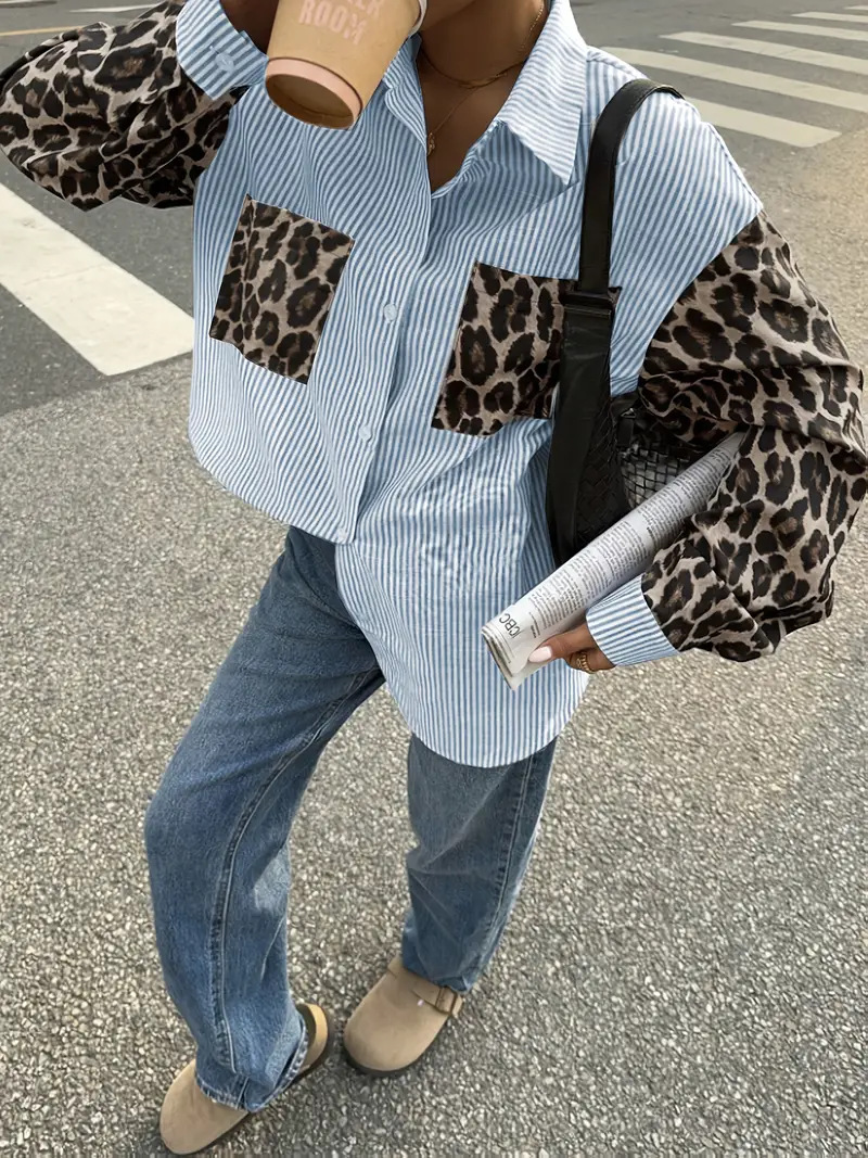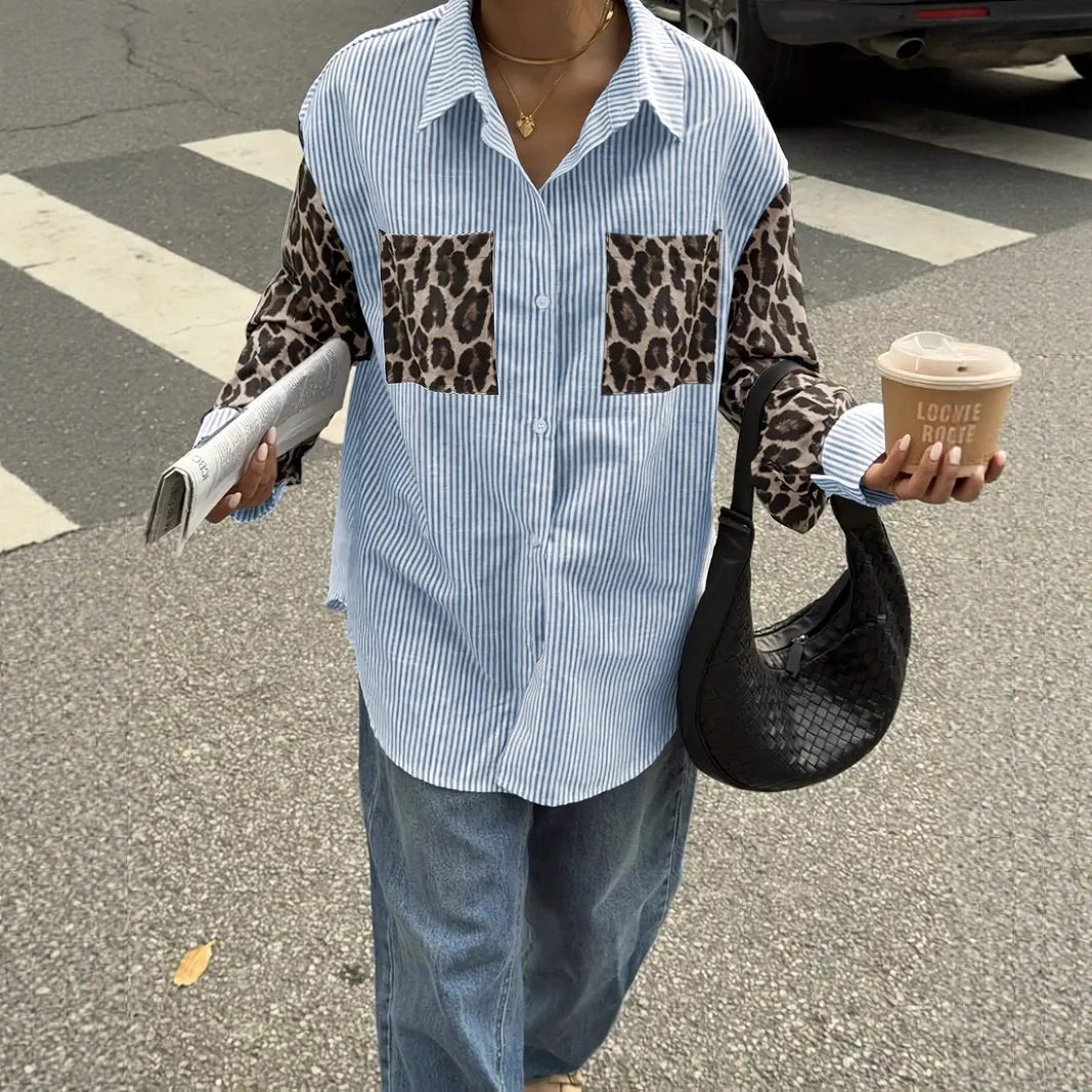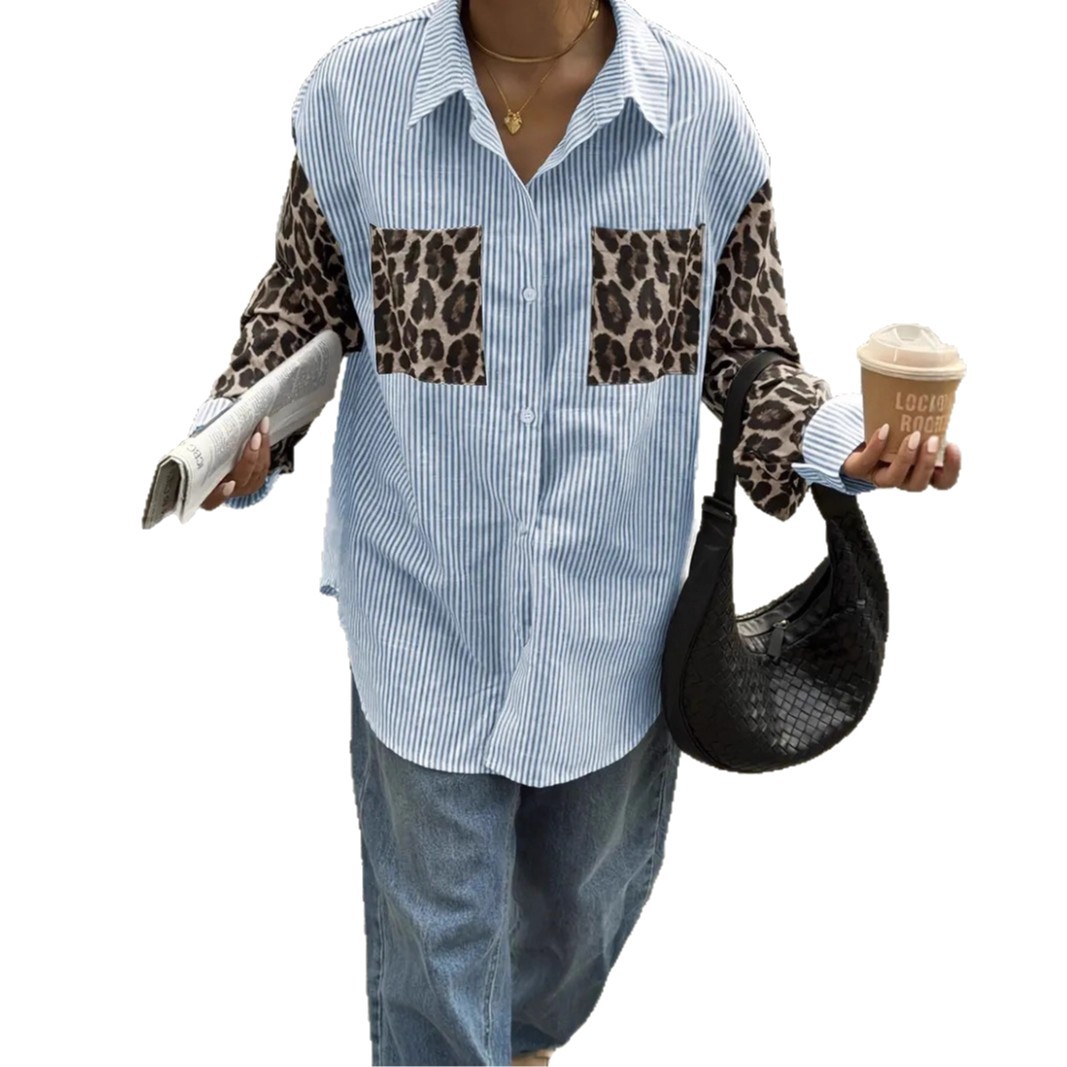 Womens Loose Casual Leopard-Print Patchwork Striped Pocket Long-Sleeve Shirt For Amazon