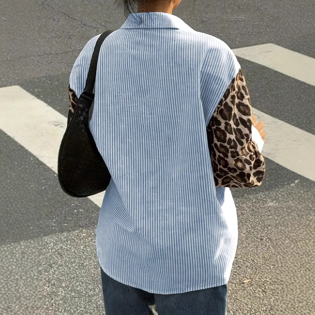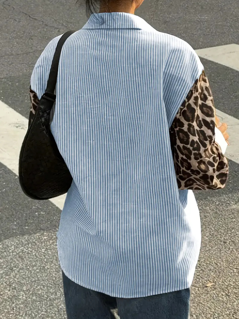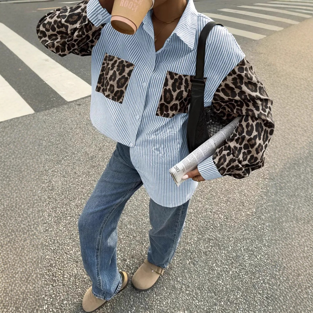 Womens Loose Casual Leopard-Print Patchwork Striped Pocket Long-Sleeve Shirt For Amazon