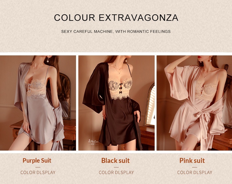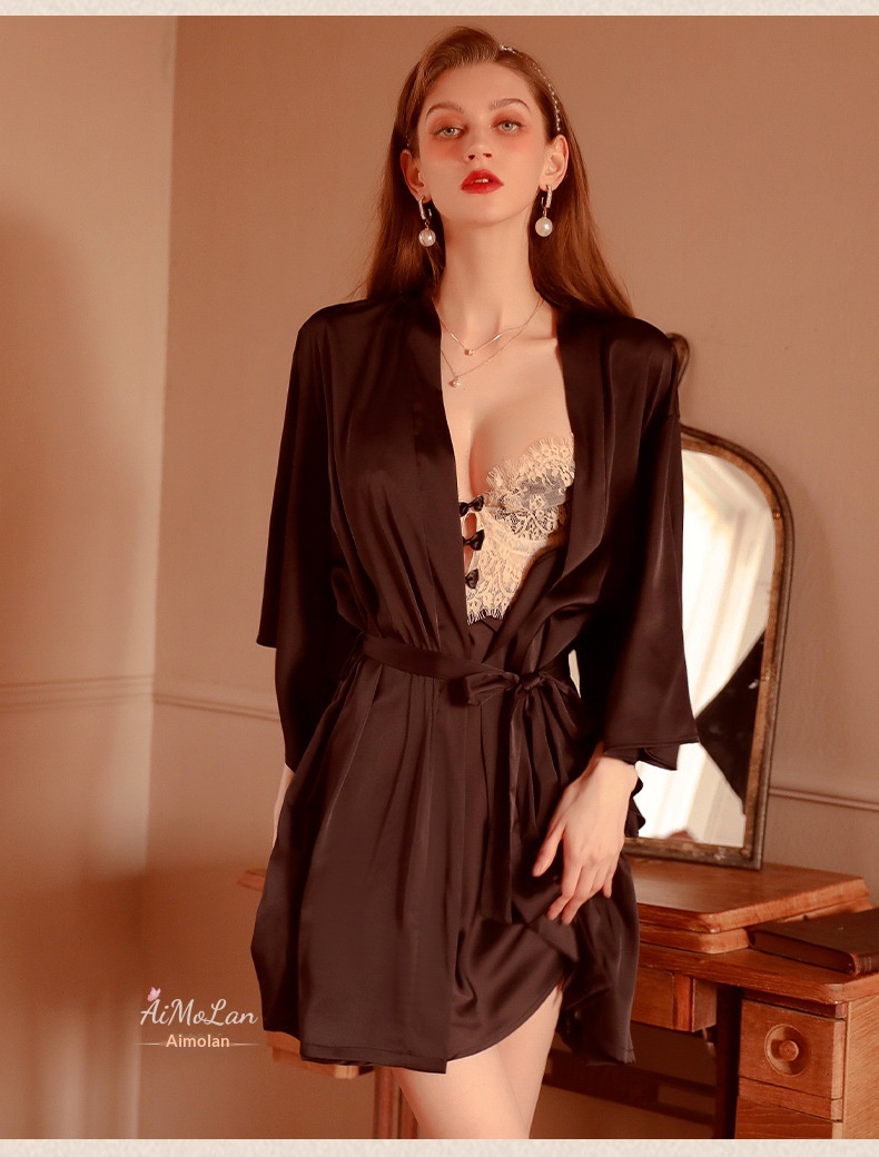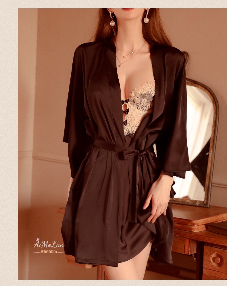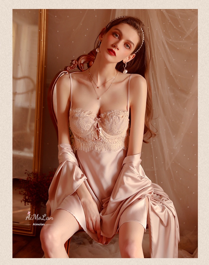 Womens Plus-Size Lace Ice Silk Underwire Camisole Bathrobe Set