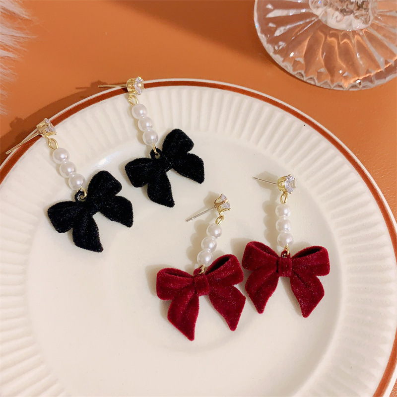Product information:Processing Technique: FlockingColor: Red Bow Earrings, Black Bow EarringsTarget Audience: WomenMaterial: AlloyDesign: BowTrendy Element: BowStyle: Korean Style Packing list: Earr...